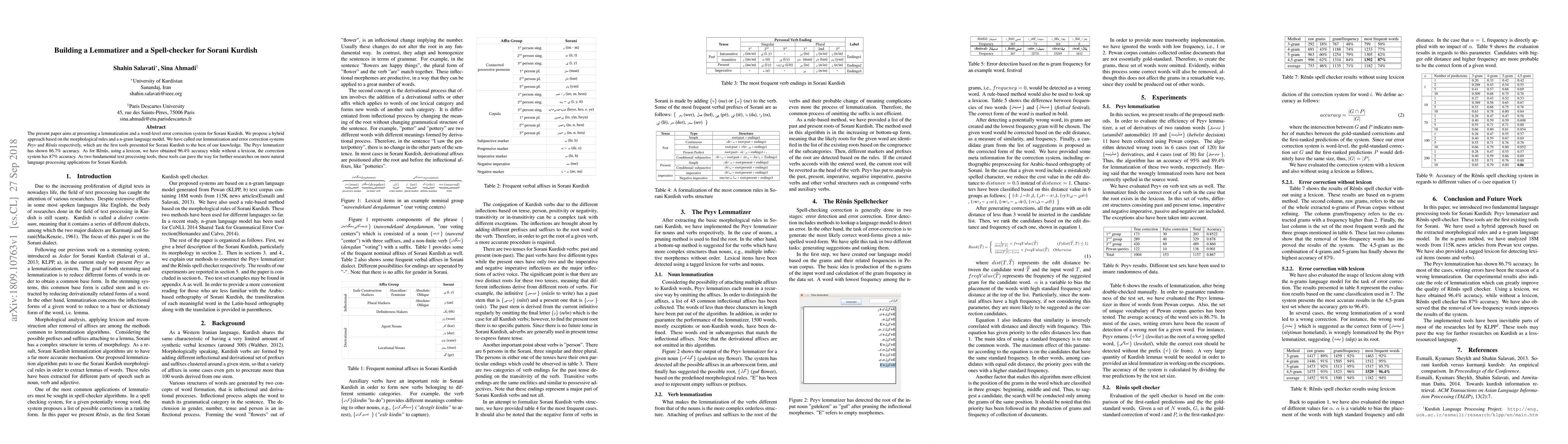 This paper introduces Peyv, a lemmatizer, and R^enus, a spell-checker for Sorani Kurdish, employing a hybrid method combining morphological rules and n-gram language models. Both tools demonstrate high accuracy, paving the way for advanced natural language processing applications in Sorani Kurdish.