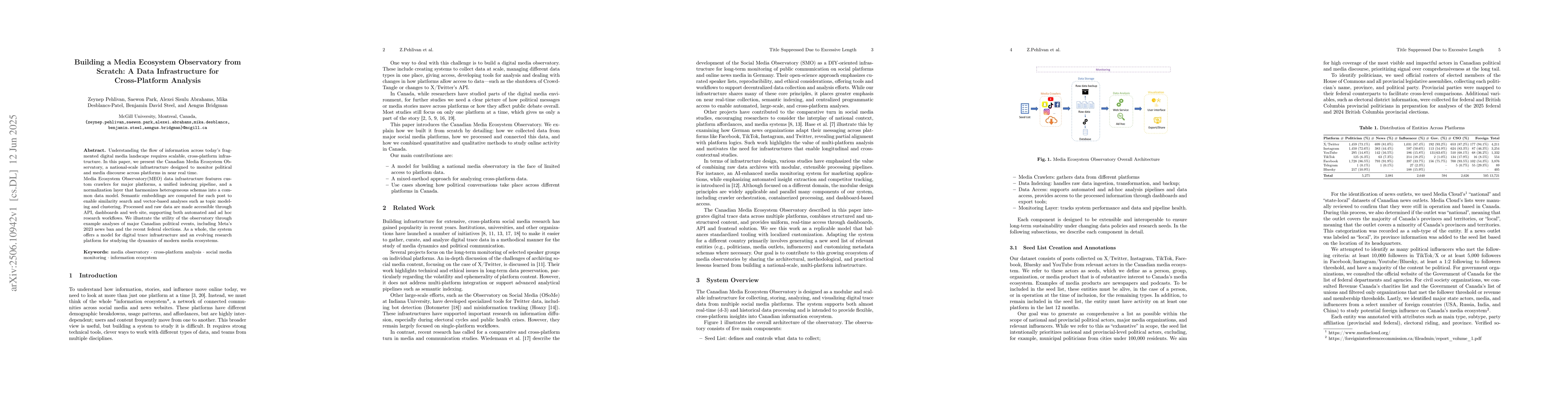 Understanding the flow of information across today's fragmented digital media landscape requires scalable, cross-platform infrastructure. In this paper, we present the Canadian Media Ecosystem Observatory, a national-scale infrastructure designed to monitor political and media discourse across platforms in near real time. Media Ecosystem Observatory (MEO) data infrastructure features custom crawlers for major platforms, a unified indexing pipeline, and a normalization layer that harmonizes heterogeneous schemas into a common data model. Semantic embeddings are computed for each post to enable similarity search and vector-based analyses such as topic modeling and clustering. Processed and raw data are made accessible through API, dashboards and website, supporting both automated and ad hoc research workflows. We illustrate the utility of the observatory through example analyses of major Canadian political events, including Meta's 2023 news ban and the recent federal elections. As a whole, the system offers a model for digital trace infrastructure and an evolving research platform for studying the dynamics of modern media ecosystems.