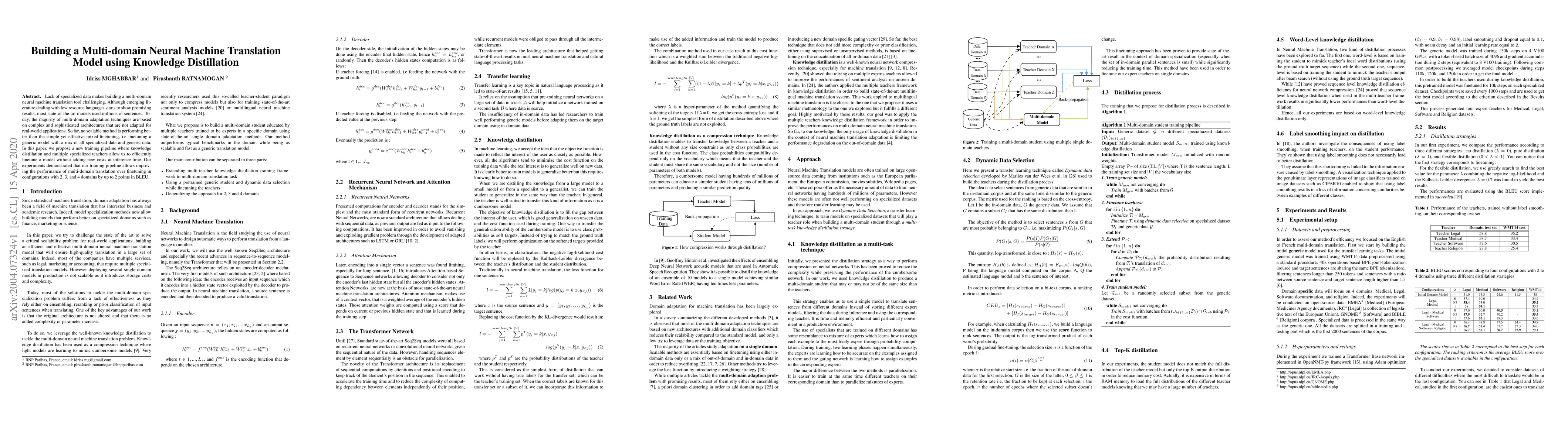 This paper proposes a scalable multi-domain neural machine translation model using knowledge distillation with multiple specialized teachers to improve translation performance without increasing inference costs. Experiments show up to a 2-point BLEU score improvement over mixed-finetuning in 2 to 4 domain configurations.