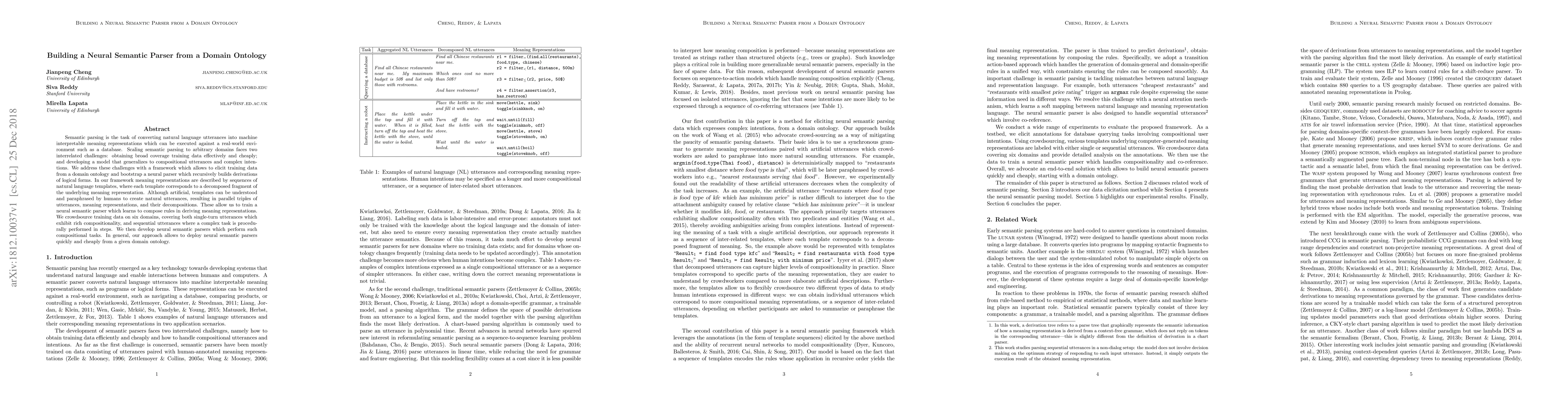 This paper presents a framework for building neural semantic parsers from domain ontologies, addressing the challenges of obtaining training data and model generalization. The approach uses natural language templates derived from the ontology to crowdsource training data and trains a neural parser that can handle complex, compositional utterances.