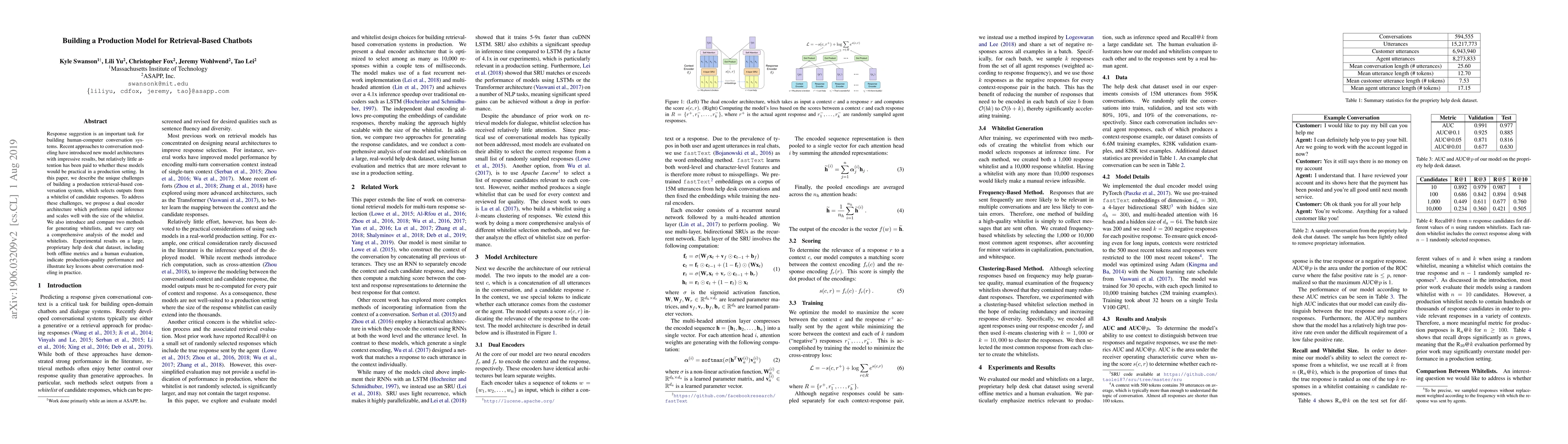 This paper presents a production model for retrieval-based chatbots, addressing the practical challenges of building a system that selects responses from a whitelist. The proposed dual encoder architecture ensures rapid inference and scalability. The authors also introduce and compare whitelist generation methods, demonstrating production-quality performance on a large help desk dataset through offline metrics and human evaluation.