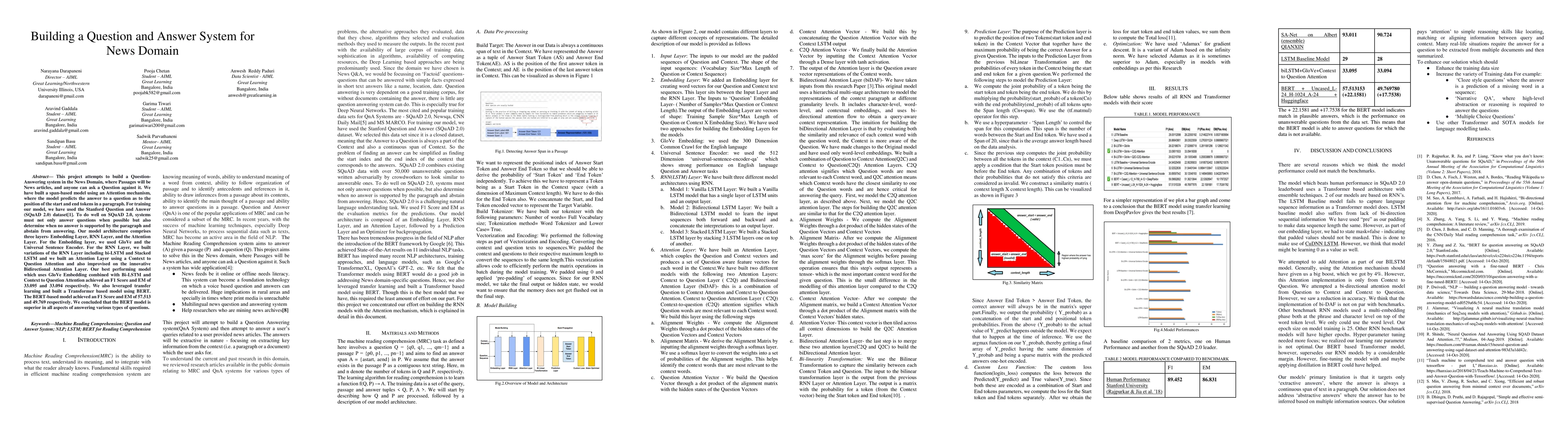 This project attempts to build a Question- Answering system in the News Domain, where Passages will be News articles, and anyone can ask a Question against it. We have built a span-based model using an Attention mechanism, where the model predicts the answer to a question as to the position of the start and end tokens in a paragraph. For training our model, we have used the Stanford Question and Answer (SQuAD 2.0) dataset[1]. To do well on SQuAD 2.0, systems must not only answer questions when possible but also determine when no answer is supported by the paragraph and abstain from answering. Our model architecture comprises three layers- Embedding Layer, RNN Layer, and the Attention Layer. For the Embedding layer, we used GloVe and the Universal Sentence Encoder. For the RNN Layer, we built variations of the RNN Layer including bi-LSTM and Stacked LSTM and we built an Attention Layer using a Context to Question Attention and also improvised on the innovative Bidirectional Attention Layer. Our best performing model which uses GloVe Embedding combined with Bi-LSTM and Context to Question Attention achieved an F1 Score and EM of 33.095 and 33.094 respectively. We also leveraged transfer learning and built a Transformer based model using BERT. The BERT-based model achieved an F1 Score and EM of 57.513 and 49.769 respectively. We concluded that the BERT model is superior in all aspects of answering various types of questions.