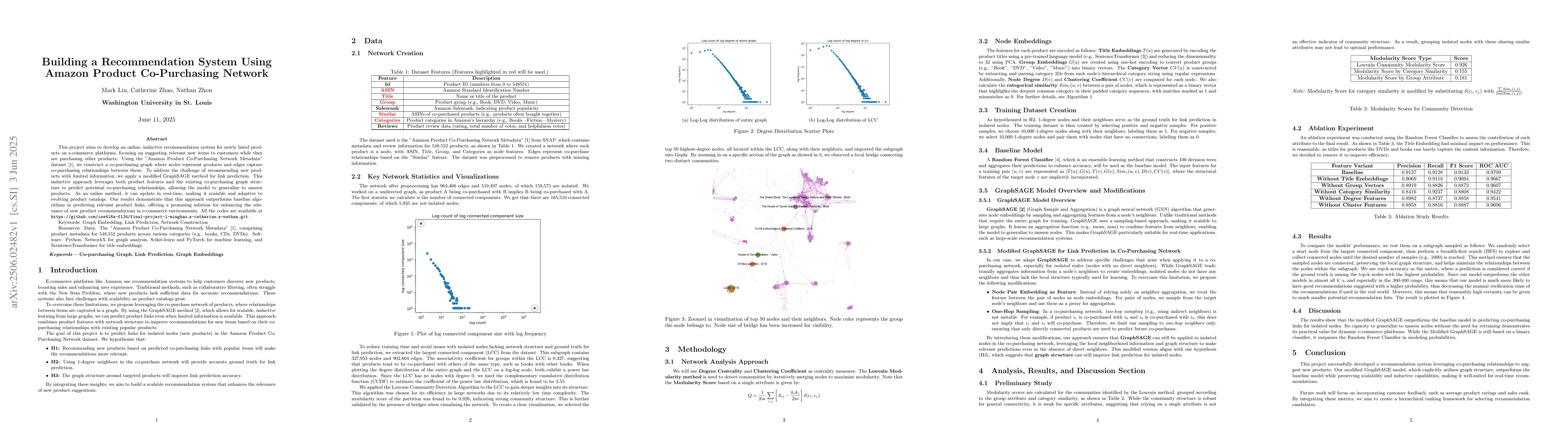 The research constructs a co-purchasing graph using Amazon Product Co-Purchasing Network Metadata, applying a modified GraphSAGE method for link prediction to recommend new products with limited information.