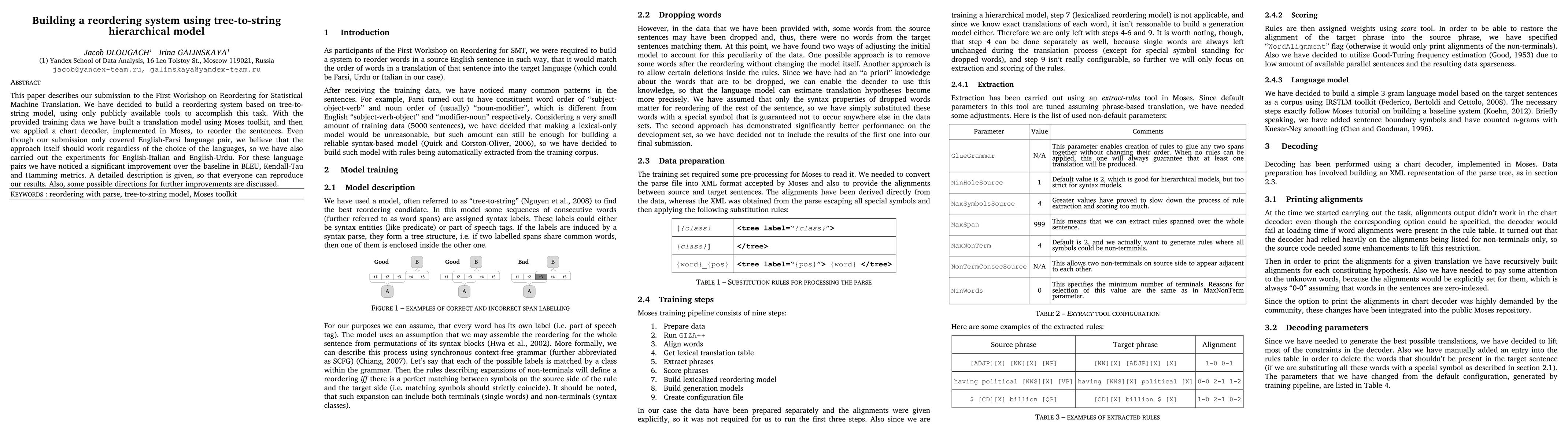 This paper describes our submission to the First Workshop on Reordering for Statistical Machine Translation. We have decided to build a reordering system based on tree-to-string model, using only publicly available tools to accomplish this task. With the provided training data we have built a translation model using Moses toolkit, and then we applied a chart decoder, implemented in Moses, to reorder the sentences. Even though our submission only covered English-Farsi language pair, we believe that the approach itself should work regardless of the choice of the languages, so we have also carried out the experiments for English-Italian and English-Urdu. For these language pairs we have noticed a significant improvement over the baseline in BLEU, Kendall-Tau and Hamming metrics. A detailed description is given, so that everyone can reproduce our results. Also, some possible directions for further improvements are discussed.