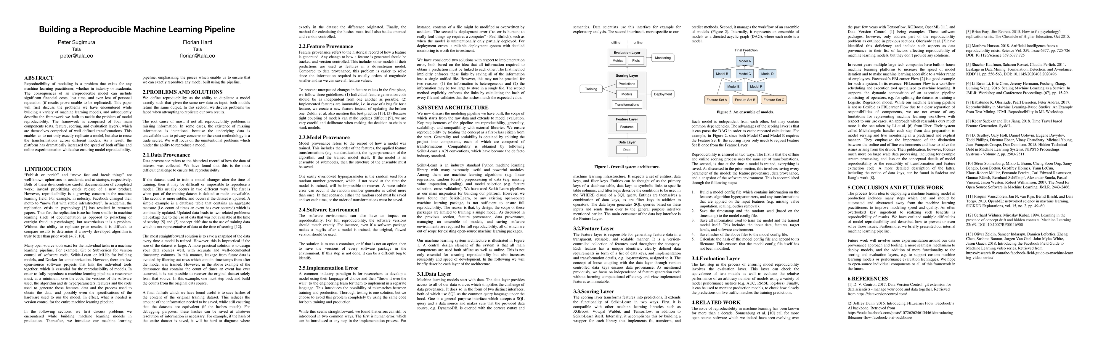 Reproducibility of modeling is a problem that exists for any machine learning practitioner, whether in industry or academia. The consequences of an irreproducible model can include significant financial costs, lost time, and even loss of personal reputation (if results prove unable to be replicated). This paper will first discuss the problems we have encountered while building a variety of machine learning models, and subsequently describe the framework we built to tackle the problem of model reproducibility. The framework is comprised of four main components (data, feature, scoring, and evaluation layers), which are themselves comprised of well defined transformations. This enables us to not only exactly replicate a model, but also to reuse the transformations across different models. As a result, the platform has dramatically increased the speed of both offline and online experimentation while also ensuring model reproducibility.
