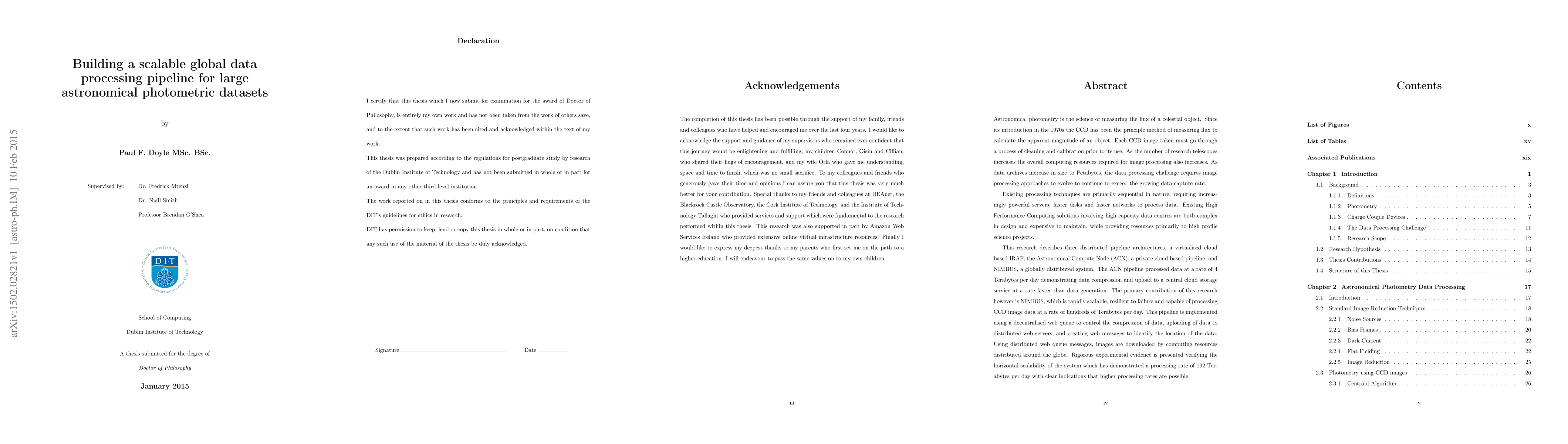 This research develops scalable global data processing pipelines for large astronomical photometric datasets, focusing on three architectures: a virtualised cloud-based IRAF, the Astronomical Compute Node, and NIMBUS. NIMBUS, a decentralized system, achieved a processing rate of 192 Terabytes per day, demonstrating scalability, resilience, and efficient data management.