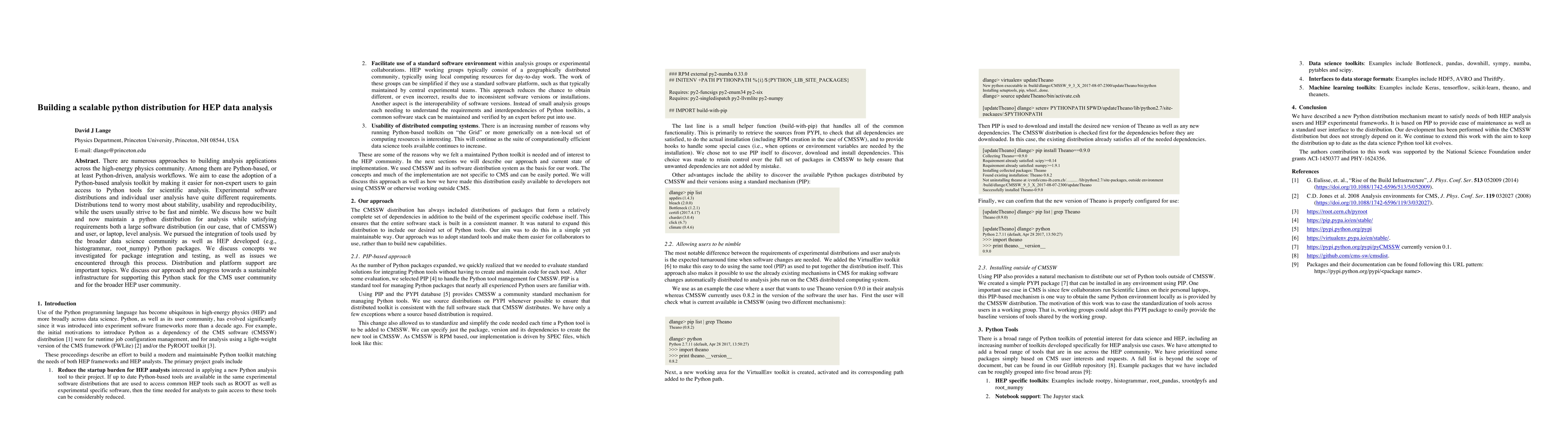 This paper details the development of a scalable Python distribution tailored for high-energy physics (HEP) data analysis, aiming to balance the needs of large software distributions and individual user workflows. The authors focus on integrating tools from both the data science and HEP communities, addressing stability, usability, and reproducibility while maintaining flexibility for users.