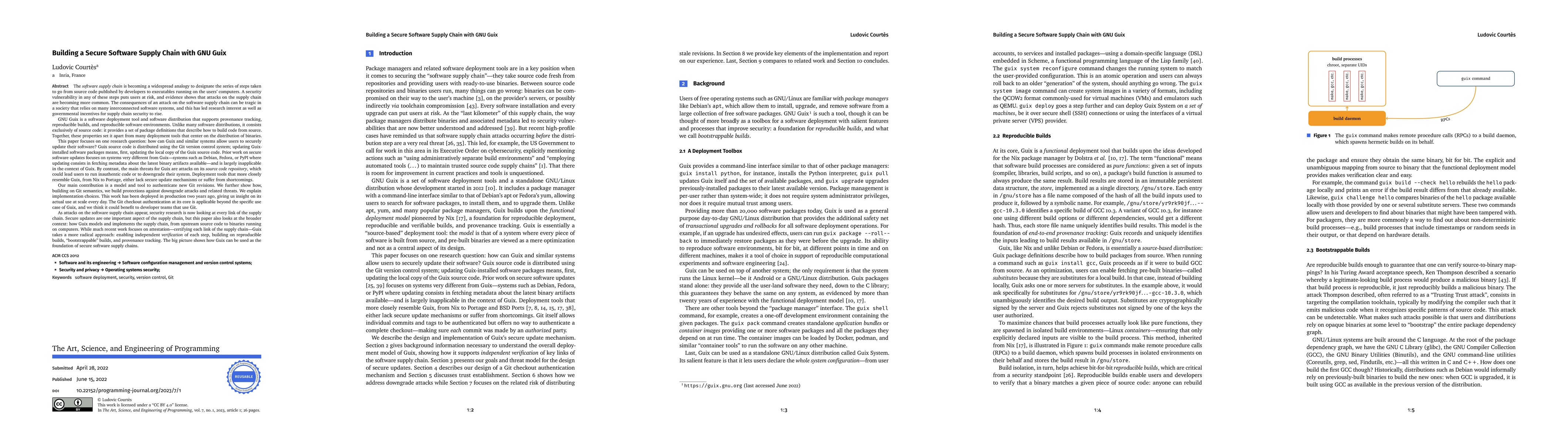 This paper proposes a model and tool for secure software updates in GNU Guix, focusing on authenticating Git revisions to prevent attacks on the software supply chain. It highlights how Guix's unique approach to source code distribution and reproducible builds enables independent verification and protection against downgrade attacks, offering a foundation for secure software supply chains.