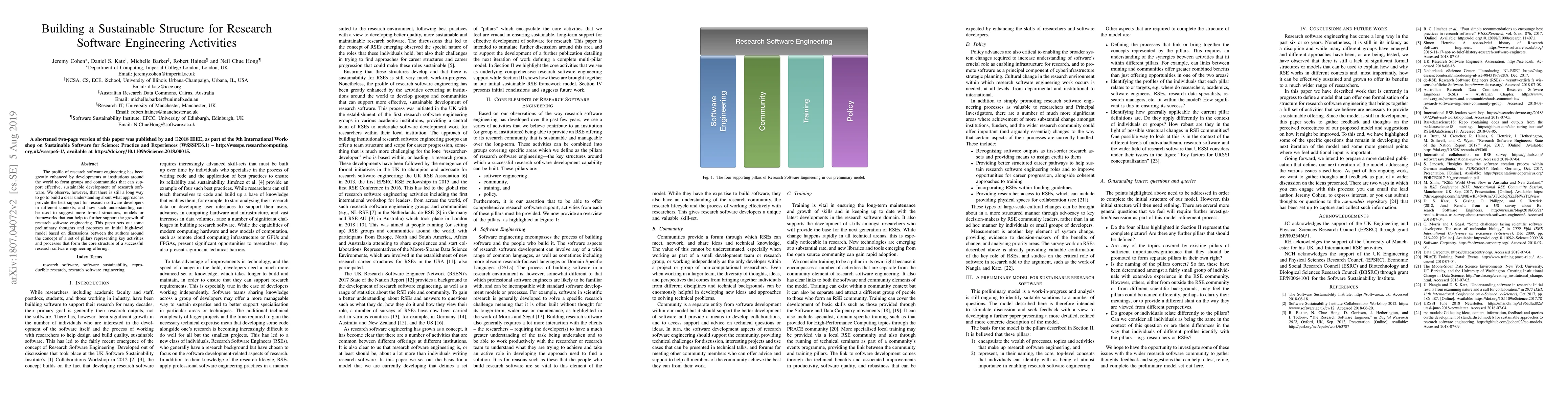 This paper explores the development of research software engineering, highlighting the need for clearer approaches and structures to support software developers. It proposes a high-level model based on key activities and processes, suggesting a set of pillars to form the foundation of a sustainable research software engineering framework.