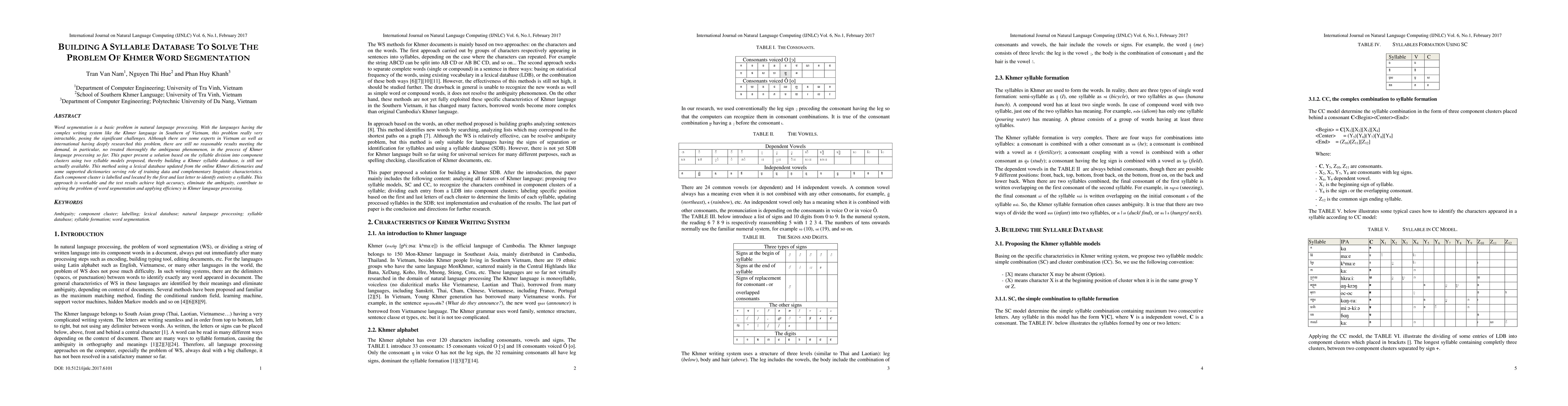 This paper presents a method for Khmer word segmentation using syllable division into component clusters, utilizing two proposed syllable models to build a Khmer syllable database. The approach achieves high accuracy and eliminates ambiguity, significantly advancing the processing of the Khmer language.