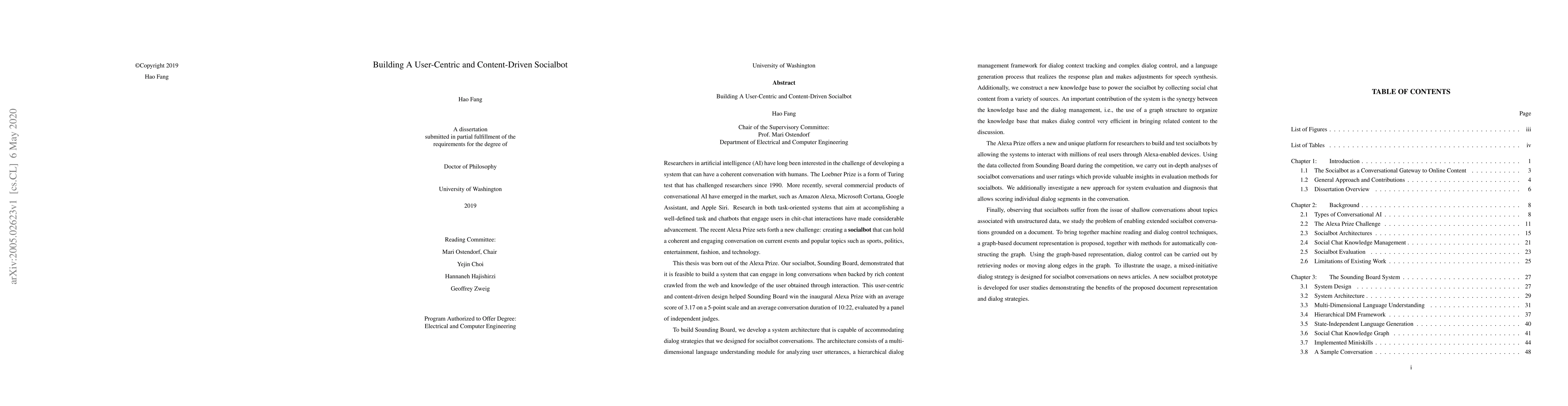To build Sounding Board, we develop a system architecture that is capable of accommodating dialog strategies that we designed for socialbot conversations. The architecture consists of a multi-dimensional language understanding module for analyzing user utterances, a hierarchical dialog management framework for dialog context tracking and complex dialog control, and a language generation process that realizes the response plan and makes adjustments for speech synthesis. Additionally, we construct a new knowledge base to power the socialbot by collecting social chat content from a variety of sources. An important contribution of the system is the synergy between the knowledge base and the dialog management, i.e., the use of a graph structure to organize the knowledge base that makes dialog control very efficient in bringing related content to the discussion. Using the data collected from Sounding Board during the competition, we carry out in-depth analyses of socialbot conversations and user ratings which provide valuable insights in evaluation methods for socialbots. We additionally investigate a new approach for system evaluation and diagnosis that allows scoring individual dialog segments in the conversation. Finally, observing that socialbots suffer from the issue of shallow conversations about topics associated with unstructured data, we study the problem of enabling extended socialbot conversations grounded on a document. To bring together machine reading and dialog control techniques, a graph-based document representation is proposed, together with methods for automatically constructing the graph. Using the graph-based representation, dialog control can be carried out by retrieving nodes or moving along edges in the graph. To illustrate the usage, a mixed-initiative dialog strategy is designed for socialbot conversations on news articles.
