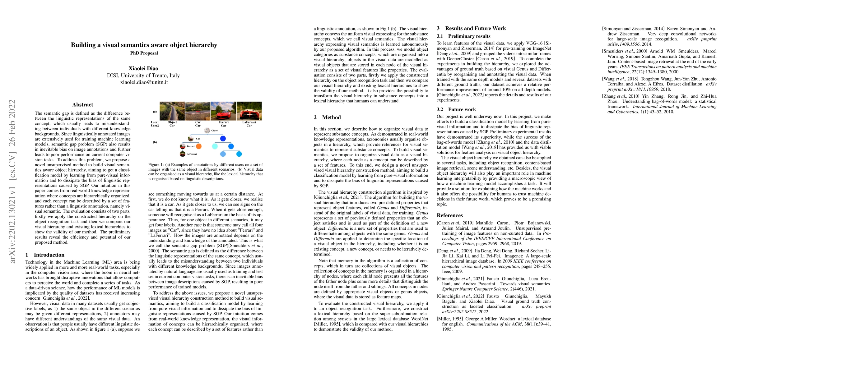 The semantic gap is defined as the difference between the linguistic representations of the same concept, which usually leads to misunderstanding between individuals with different knowledge backgrounds. Since linguistically annotated images are extensively used for training machine learning models, semantic gap problem (SGP) also results in inevitable bias on image annotations and further leads to poor performance on current computer vision tasks. To address this problem, we propose a novel unsupervised method to build visual semantics aware object hierarchy, aiming to get a classification model by learning from pure-visual information and to dissipate the bias of linguistic representations caused by SGP. Our intuition in this paper comes from real-world knowledge representation where concepts are hierarchically organized, and each concept can be described by a set of features rather than a linguistic annotation, namely visual semantic. The evaluation consists of two parts, firstly we apply the constructed hierarchy on the object recognition task and then we compare our visual hierarchy and existing lexical hierarchies to show the validity of our method. The preliminary results reveal the efficiency and potential of our proposed method.