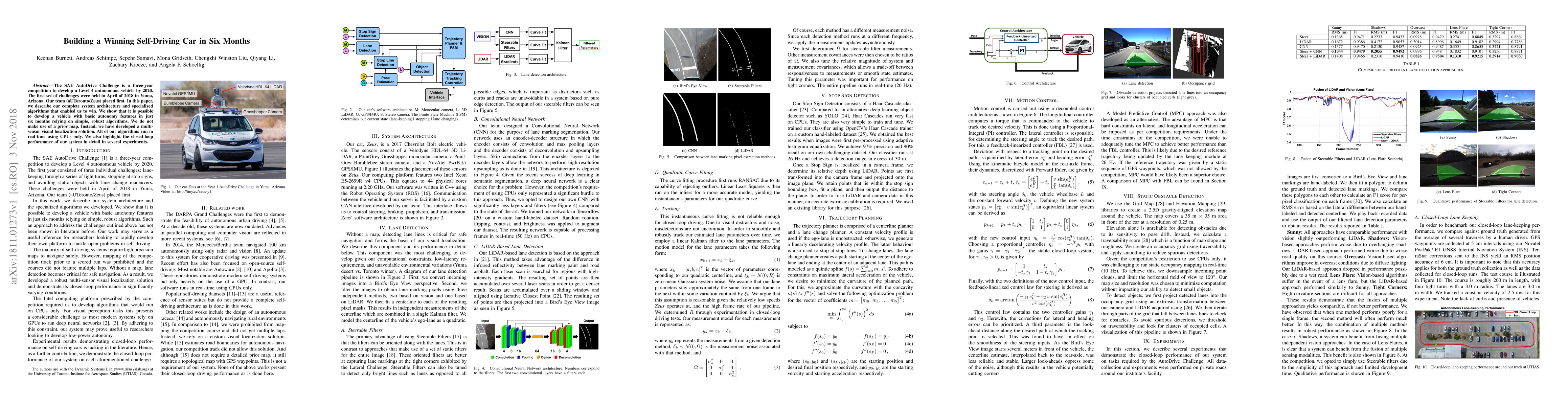 The SAE AutoDrive Challenge is a three-year competition to develop a Level 4 autonomous vehicle by 2020. The first set of challenges were held in April of 2018 in Yuma, Arizona. Our team (aUToronto/Zeus) placed first. In this paper, we describe our complete system architecture and specialized algorithms that enabled us to win. We show that it is possible to develop a vehicle with basic autonomy features in just six months relying on simple, robust algorithms. We do not make use of a prior map. Instead, we have developed a multi-sensor visual localization solution. All of our algorithms run in real-time using CPUs only. We also highlight the closed-loop performance of our system in detail in several experiments.