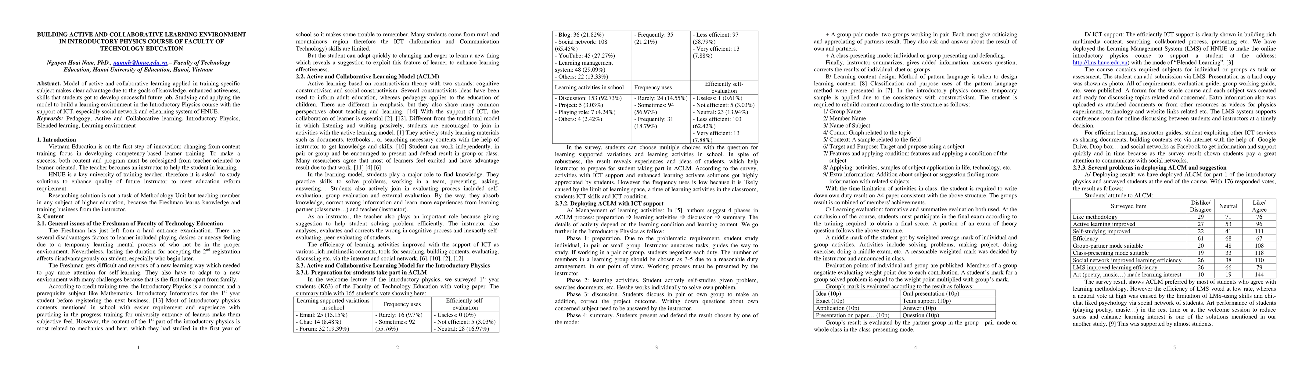 Model of active and collaborative learning applied in training specific subject makes clear advantage due to the goals of knowledge, enhanced activeness, skills that students got to develop successful future job. Studying and applying the model to build a learning environment in the Introductory Physics course with the support of ICT, especially social network and eLearning system of HNUE.