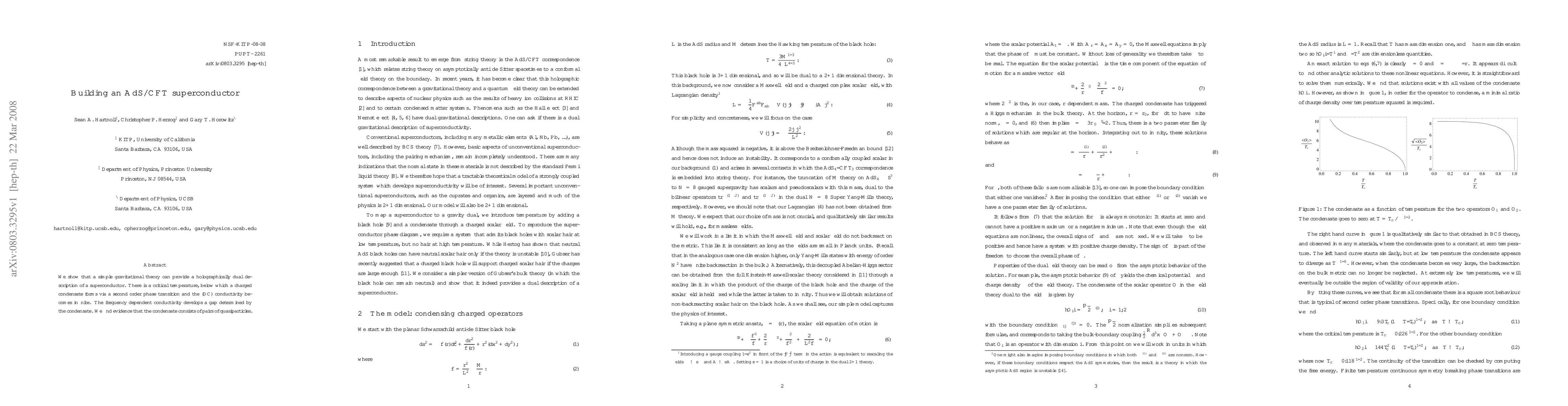 A gravitational theory provides a holographic dual description of a superconductor, predicting a critical temperature below which infinite conductivity occurs due to a second-order phase transition.