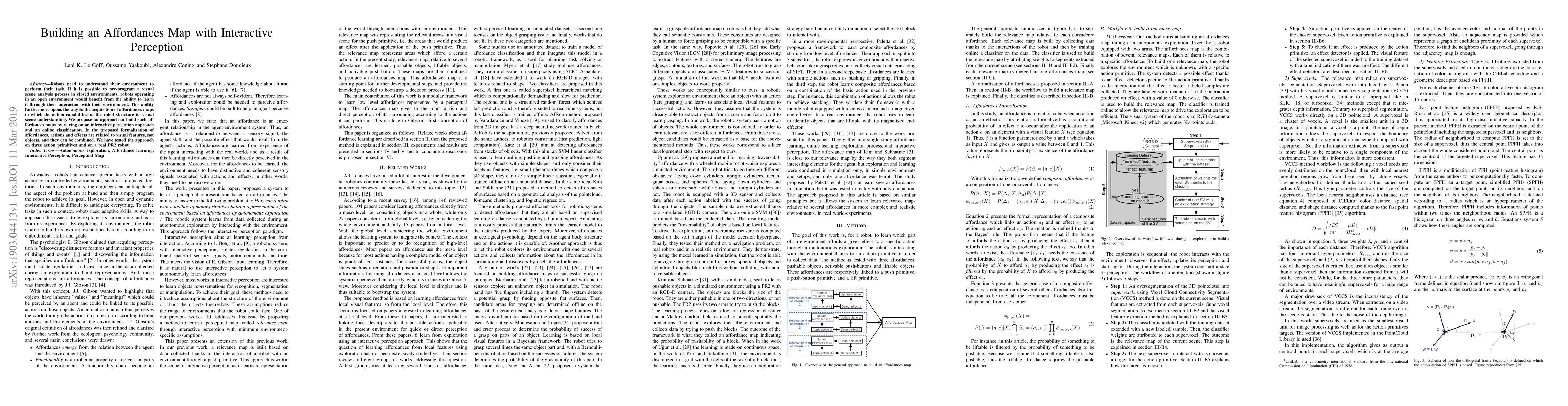 This paper proposes an interactive perception method to build affordances maps for robots, enabling them to learn and understand their open environment through interaction. The approach relates actions and effects to visual features rather than objects, tested on a PR2 robot with three action primitives.