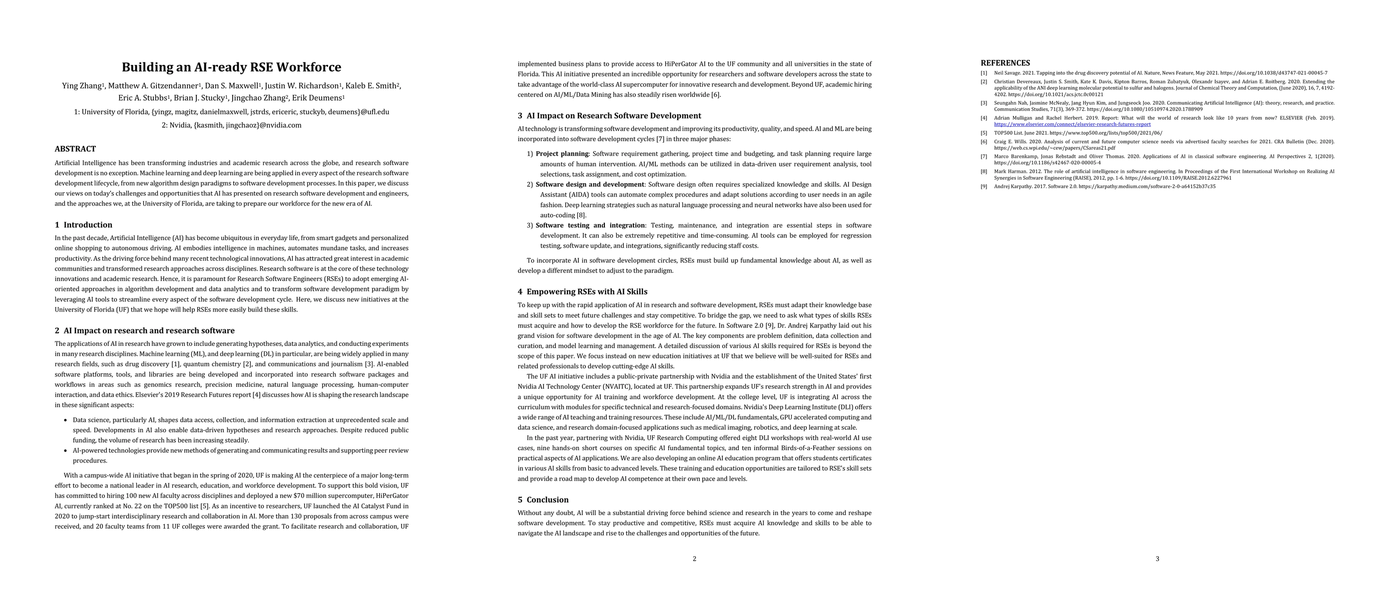 Artificial Intelligence has been transforming industries and academic research across the globe, and research software development is no exception. Machine learning and deep learning are being applied in every aspect of the research software development lifecycles, from new algorithm design paradigms to software development processes. In this paper, we discuss our views on today's challenges and opportunities that AI has presented on research software development and engineers, and the approaches we, at the University of Florida, are taking to prepare our workforce for the new era of AI.
