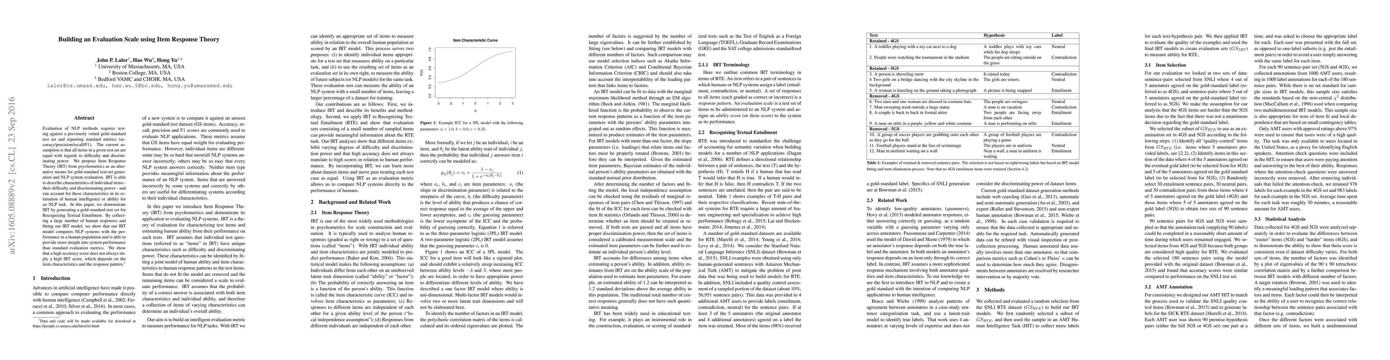 This paper proposes using Item Response Theory (IRT) to generate a gold-standard test set and evaluate NLP methods, showing that IRT can provide deeper insights into system performance than standard metrics, as it accounts for item difficulty and discriminating power. The study demonstrates IRT's effectiveness in Recognizing Textual Entailment.