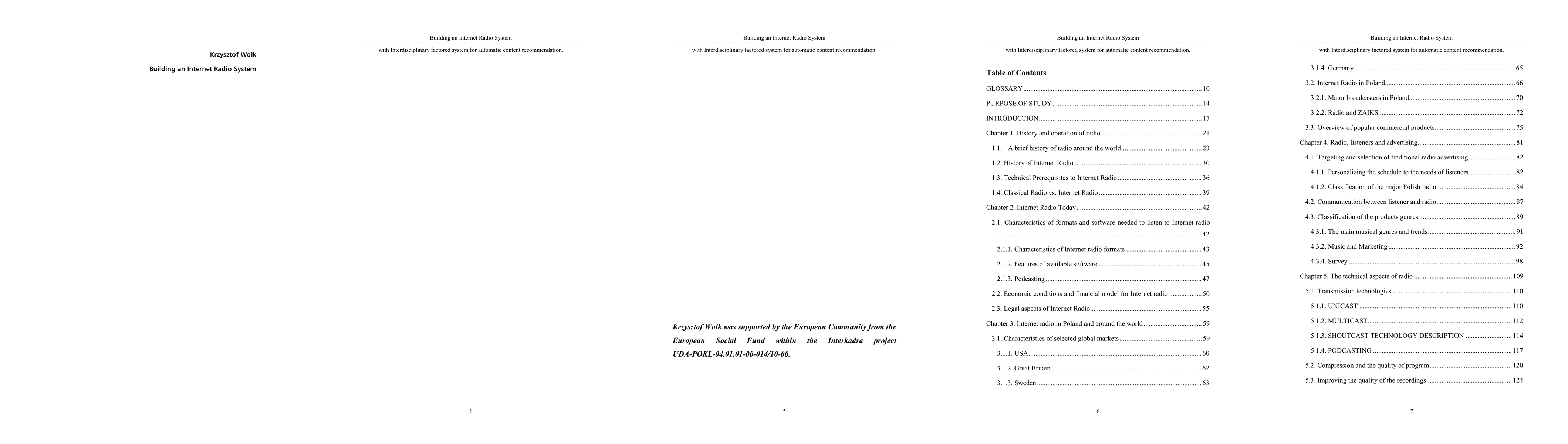 This research explores and implements automatic systems for music and advertisement content recommendation in an Internet radio system, emphasizing interdisciplinary approaches. It aims to provide an innovative Internet radio solution with automatic content recommendation and voice synthesizer for program scheduling, analyzing its influence on user experience and commercial opportunities.