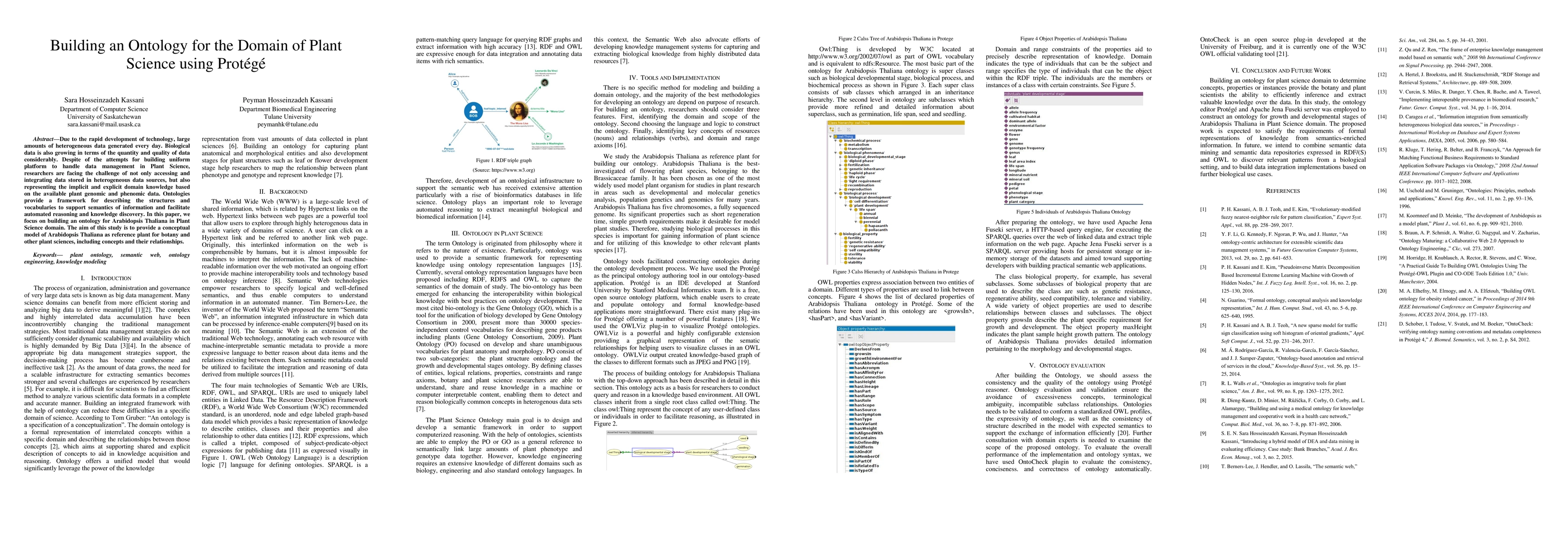This paper develops an ontology for Arabidopsis Thaliana using Protégé to manage and integrate heterogeneous plant science data, aiming to provide a conceptual model for botany and plant sciences. The ontology facilitates automated reasoning and knowledge discovery in plant genomic and phenomic data.