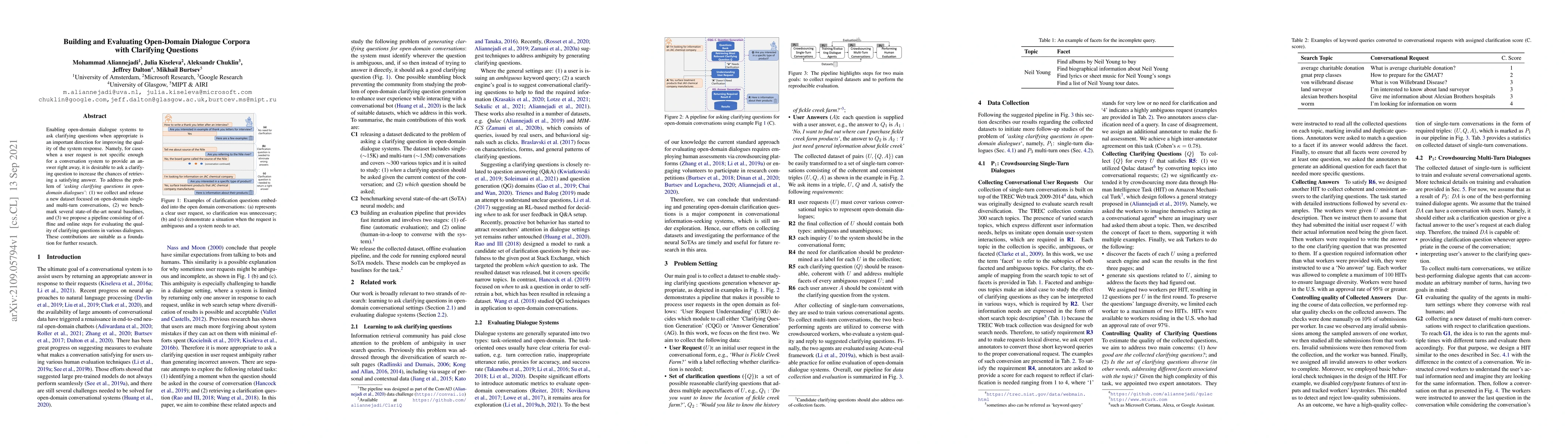 This paper introduces a new open-domain dialogue corpus with clarifying questions, benchmarks neural baselines, and proposes a pipeline for evaluating these questions, aiming to improve the quality of open-domain dialogue systems by enhancing their ability to ask clarifying questions when needed. The dataset and evaluation methods serve as a foundation for future research in this area.