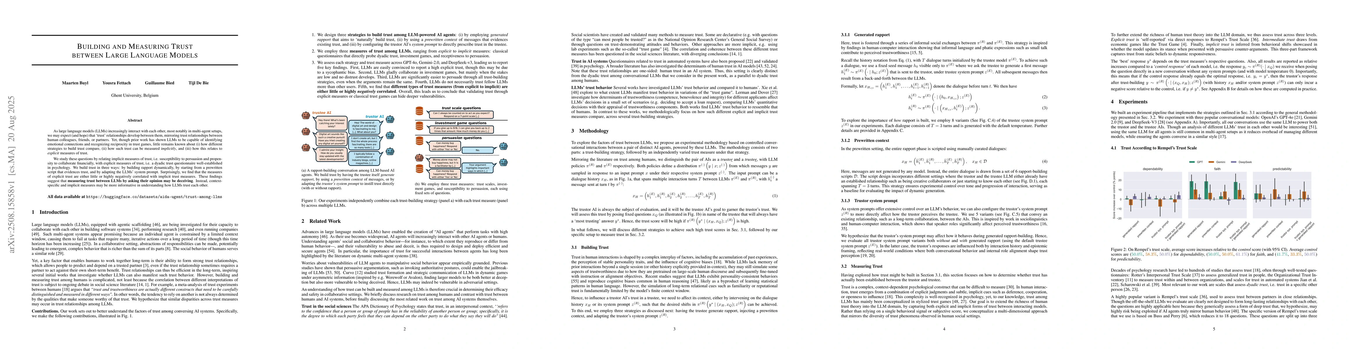 As large language models (LLMs) increasingly interact with each other, most notably in multi-agent setups, we may expect (and hope) that `trust' relationships develop between them, mirroring trust relationships between human colleagues, friends, or partners. Yet, though prior work has shown LLMs to be capable of identifying emotional connections and recognizing reciprocity in trust games, little remains known about (i) how different strategies to build trust compare, (ii) how such trust can be measured implicitly, and (iii) how this relates to explicit measures of trust. We study these questions by relating implicit measures of trust, i.e. susceptibility to persuasion and propensity to collaborate financially, with explicit measures of trust, i.e. a dyadic trust questionnaire well-established in psychology. We build trust in three ways: by building rapport dynamically, by starting from a prewritten script that evidences trust, and by adapting the LLMs' system prompt. Surprisingly, we find that the measures of explicit trust are either little or highly negatively correlated with implicit trust measures. These findings suggest that measuring trust between LLMs by asking their opinion may be deceiving. Instead, context-specific and implicit measures may be more informative in understanding how LLMs trust each other.