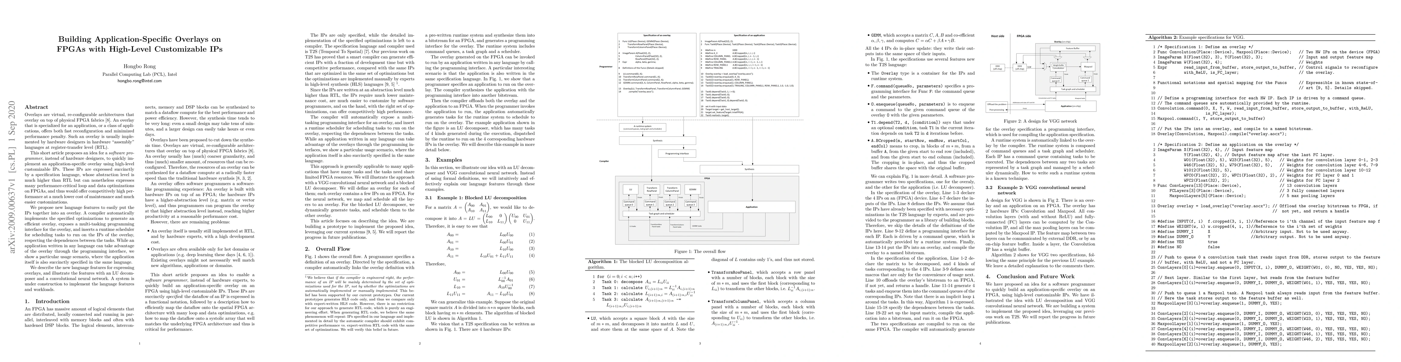 This paper proposes a method for software programmers to implement application-specific overlays on FPGAs using high-level customizable IPs, expressed in a specification language. The approach aims to achieve high performance with lower maintenance costs and easier customizations, facilitated by a compiler that generates the overlay and a runtime scheduler.