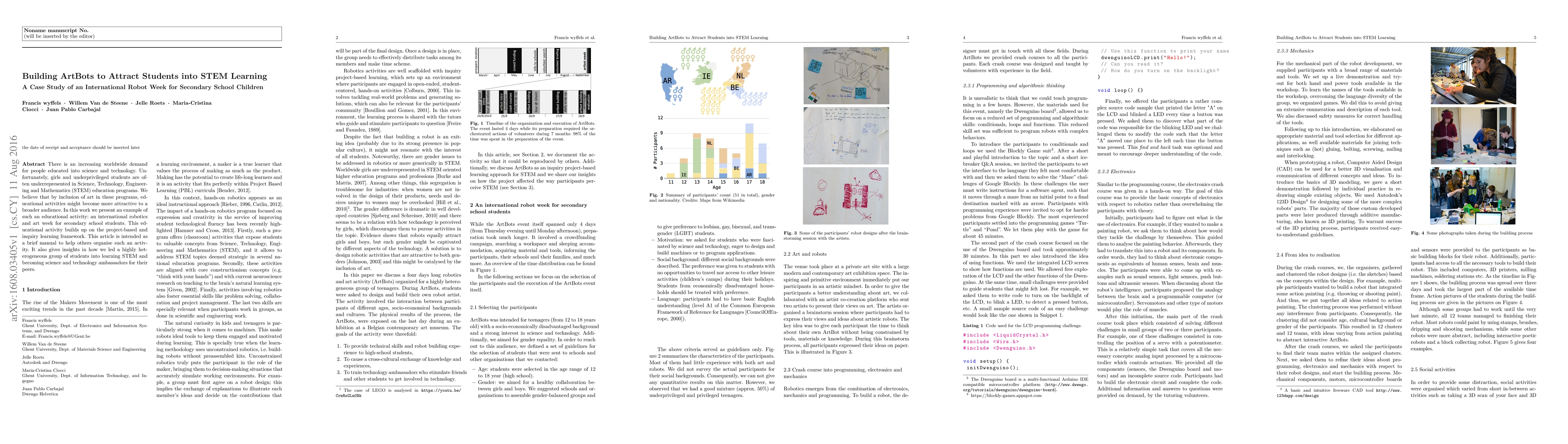 There is an increasing worldwide demand for people educated into science and technology. Unfortunately, girls and underprivileged students are often underrepresented in Science, Technology, Engineering and Mathematics (STEM) education programs. We believe that by inclusion of art in these programs, educational activities might become more attractive to a broader audience. In this work we present an example of such an educational activity: an international robotics and art week for secondary school students. This educational activity builds up on the project-based and inquiry learning framework. This article is intended as a brief manual to help others organise such an activity. It also gives insights in how we led a highly heterogeneous group of students into learning STEM and becoming science and technology ambassadors for their peers.