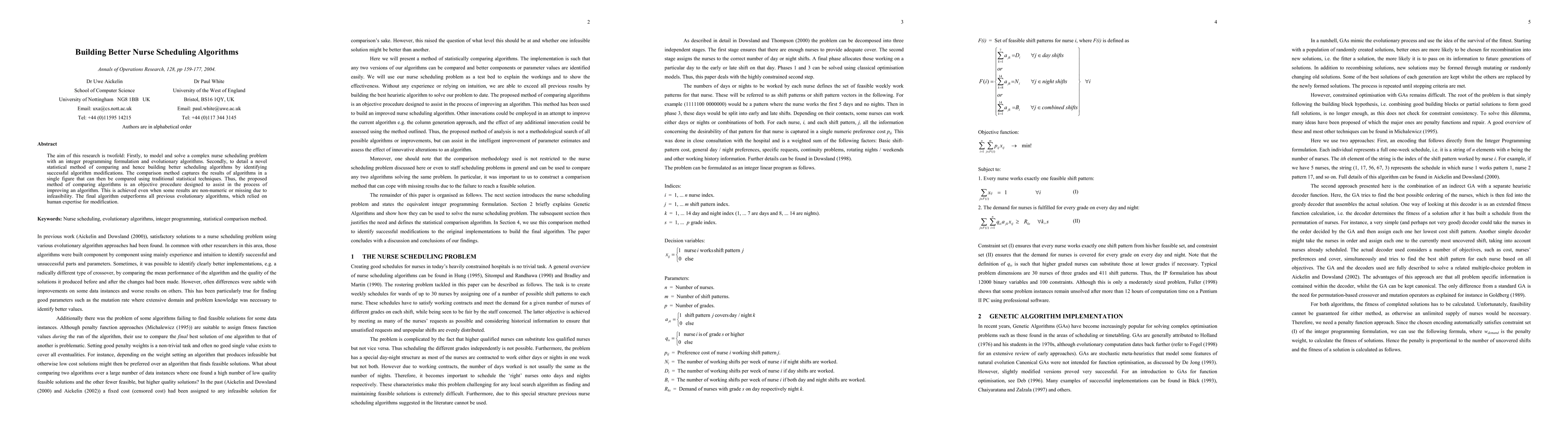 The aim of this research is twofold: Firstly, to model and solve a complex nurse scheduling problem with an integer programming formulation and evolutionary algorithms. Secondly, to detail a novel statistical method of comparing and hence building better scheduling algorithms by identifying successful algorithm modifications. The comparison method captures the results of algorithms in a single figure that can then be compared using traditional statistical techniques. Thus, the proposed method of comparing algorithms is an objective procedure designed to assist in the process of improving an algorithm. This is achieved even when some results are non-numeric or missing due to infeasibility. The final algorithm outperforms all previous evolutionary algorithms, which relied on human expertise for modification.