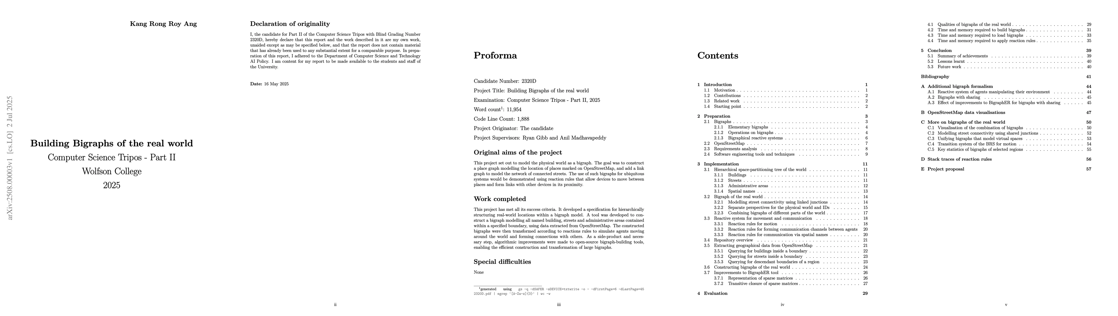 This report proposes a formal specification for organising all buildings, streets and administrative areas in the world into a hierarchical space-partitioning tree using data from OpenStreetMap. This hierarchical structure is encoded into a bigraph, serving as a digital twin of the world and capturing complete street connectivity. It presents a tool implemented in OCaml (source code at https://github.com/royangkr/bigraph-of-the-world ) that constructs bigraphs for regions from any part of the world. In addition, it contributes algorithmic improvements to open-source bigraph-building tools that enable them to efficiently construct and transform extremely large bigraphs, achieving up to a 97x speedup among other gains.