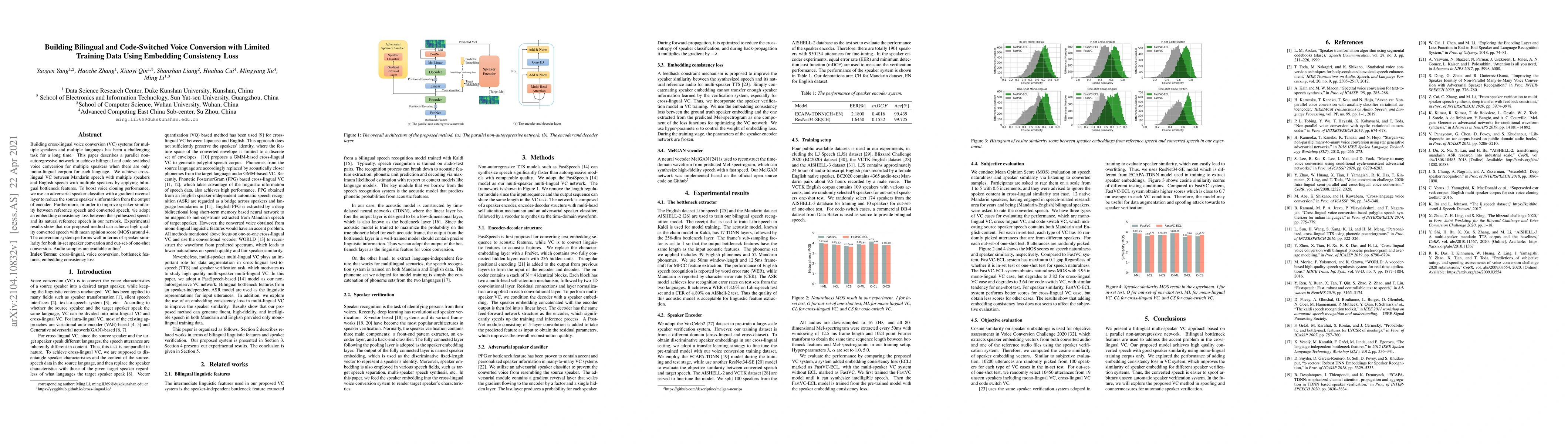This paper presents a parallel non-autoregressive network for bilingual and code-switched voice conversion using limited mono-lingual training data, achieving high-quality Mandarin-to-English conversions with mean opinion scores around 4, utilizing embedding consistency loss for improved speaker similarity.