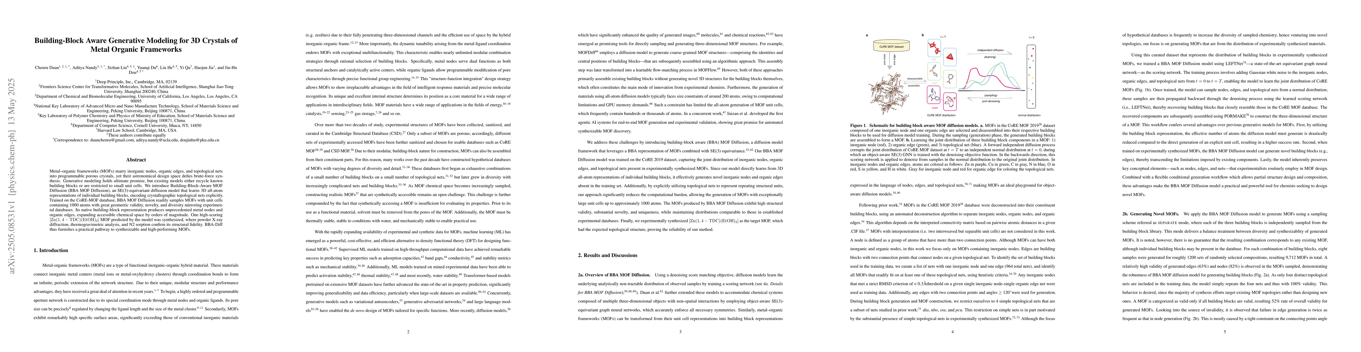 The research introduces Building-Block-Aware MOF Diffusion (BBA MOF Diffusion), an SE(3)-equivariant diffusion model that learns 3D all-atom representations of individual building blocks, encoding crystallographic topological nets explicitly. It is trained on the CoRE-MOF database.