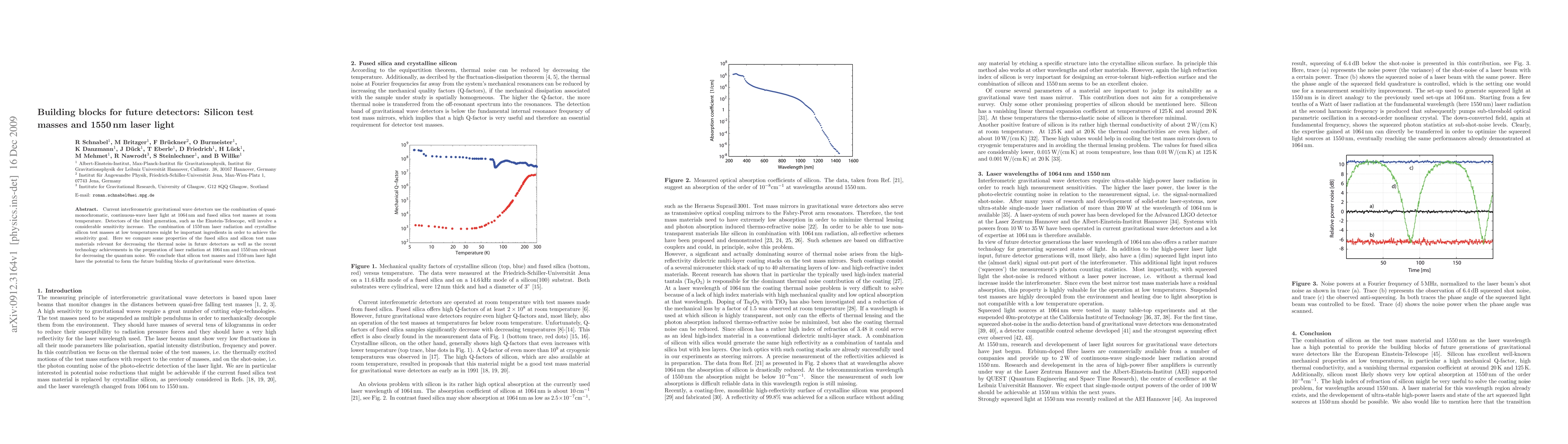 Current interferometric gravitational wave detectors use the combination of quasi-monochromatic, continuous-wave laser light at 1064 nm and fused silica test masses at room temperature. Detectors of the third generation, such as the Einstein-Telescope, will involve a considerable sensitivity increase. The combination of 1550 nm laser radiation and crystalline silicon test masses at low temperatures might be important ingredients in order to achieve the sensitivity goal. Here we compare some properties of the fused silica and silicon test mass materials relevant for decreasing the thermal noise in future detectors as well as the recent technology achievements in the preparation of laser radiation at 1064 nm and 1550 nm relevant for decreasing the quantum noise. We conclude that silicon test masses and 1550 nm laser light have the potential to form the future building blocks of gravitational wave detection.
