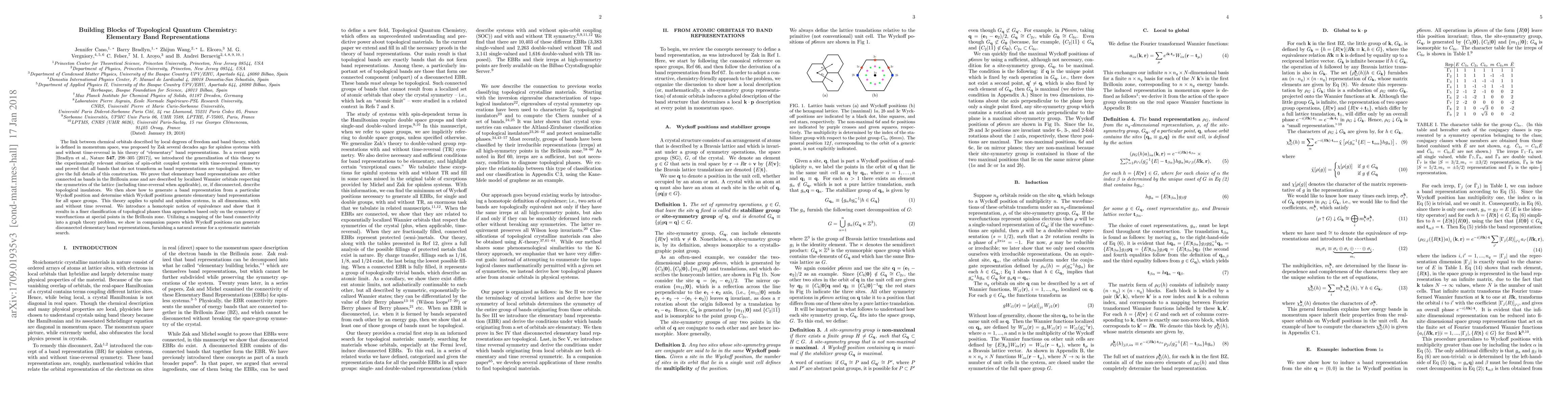 This paper details the construction and properties of elementary band representations (EBRs) in topological quantum chemistry, applicable to spinful and spinless systems across dimensions with or without time-reversal symmetry. EBRs are either localized and connected bands with Wannier orbitals respecting lattice symmetries or describe topological insulators when disconnected. The authors introduce a homotopic equivalence notion for finer topological phase classification and present a graph theory-based method for identifying Wyckoff positions generating EBRs, facilitating materials search.