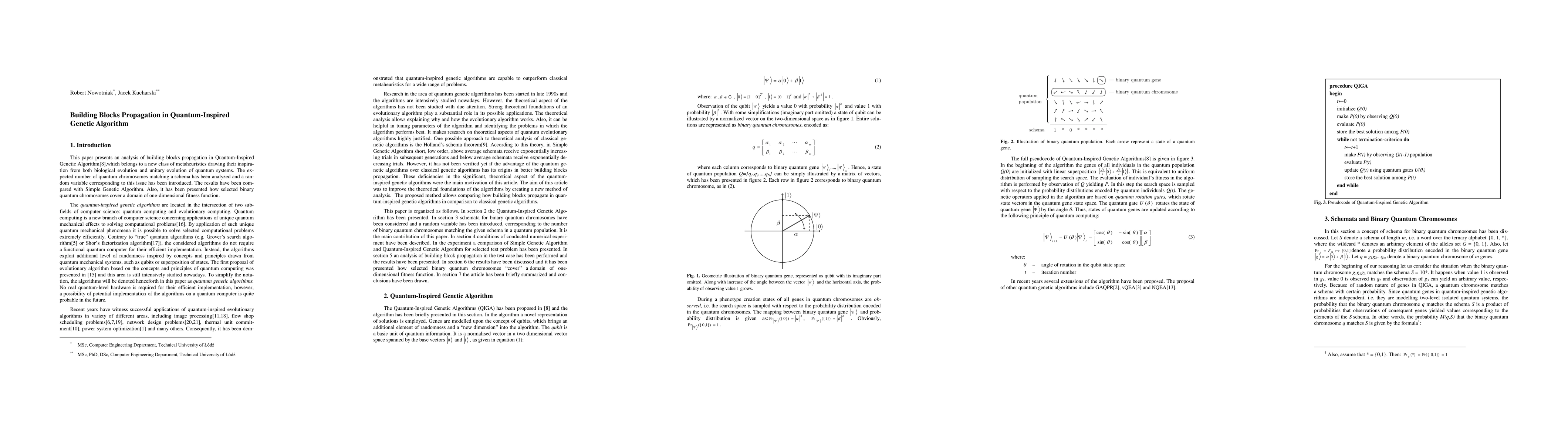 This paper analyzes building blocks propagation in Quantum-Inspired Genetic Algorithm, comparing its performance with Simple Genetic Algorithm and introducing a random variable for the expected number of matching quantum chromosomes. It also demonstrates how binary quantum chromosomes cover a one-dimensional fitness function domain.