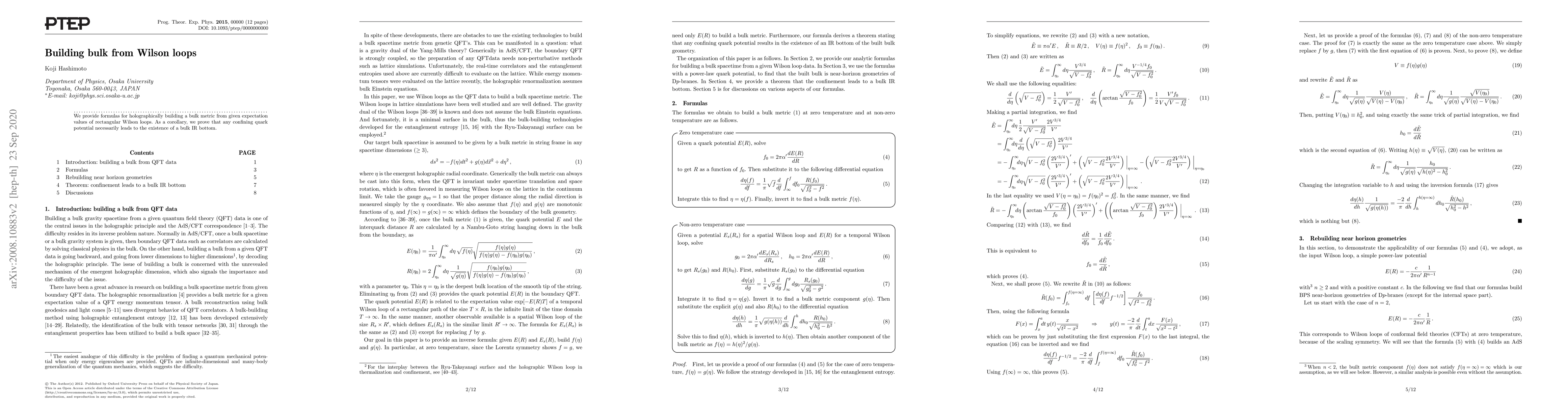 Researchers developed formulas to create a bulk metric from Wilson loop expectation values, showing that a confining quark potential always leads to an infrared 'bottom' in the bulk.