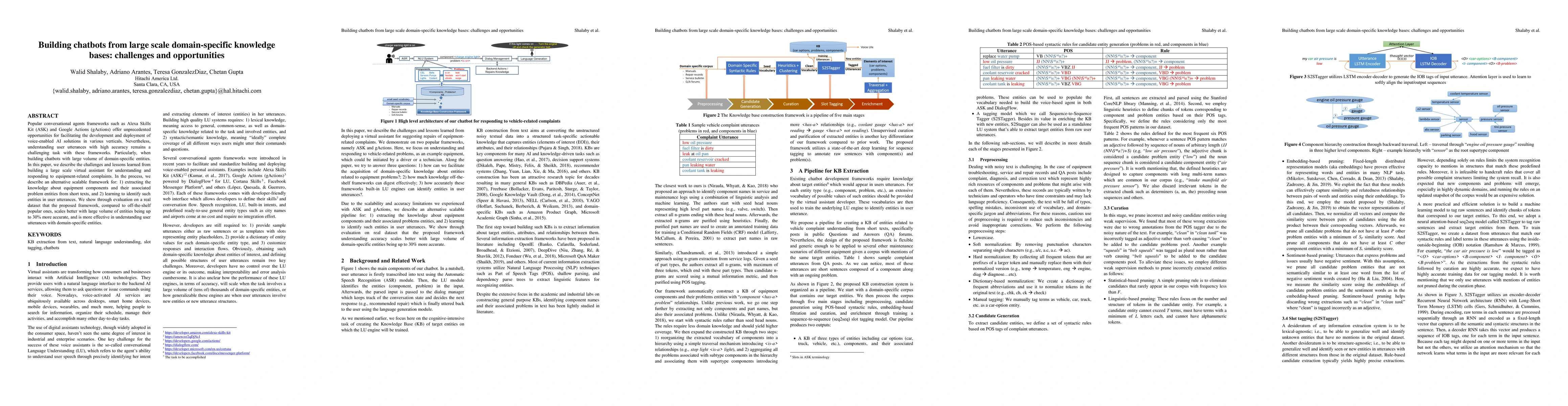 Popular conversational agents frameworks such as Alexa Skills Kit (ASK) and Google Actions (gActions) offer unprecedented opportunities for facilitating the development and deployment of voice-enabled AI solutions in various verticals. Nevertheless, understanding user utterances with high accuracy remains a challenging task with these frameworks. Particularly, when building chatbots with large volume of domain-specific entities. In this paper, we describe the challenges and lessons learned from building a large scale virtual assistant for understanding and responding to equipment-related complaints. In the process, we describe an alternative scalable framework for: 1) extracting the knowledge about equipment components and their associated problem entities from short texts, and 2) learning to identify such entities in user utterances. We show through evaluation on a real dataset that the proposed framework, compared to off-the-shelf popular ones, scales better with large volume of entities being up to 30% more accurate, and is more effective in understanding user utterances with domain-specific entities.