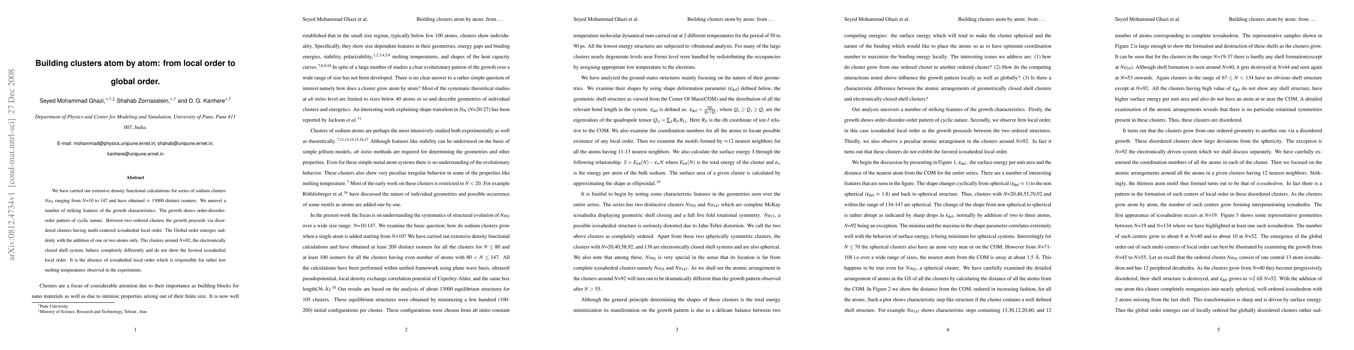 We have carried out extensive density functional calculations for series of sodium clusters $Na$$_{N}$ ranging from $N$=10 to 147 and have obtained $\approx$ 13000 distinct isomers. We unravel a number of striking features of the growth characteristics. The growth shows order-disorder-order pattern of cyclic nature. Between two ordered clusters the growth proceeds via disordered clusters having multi-centered icosahedral local order. The Global order emerges suddenly with the addition of one or two atoms only. The clusters around $N$=92, the electronically closed shell system, behave completely differently and do not show the favored icosahedral local order. It is the absence of icosahedral local order which is responsible for rather low melting temperatures observed in the experiments.