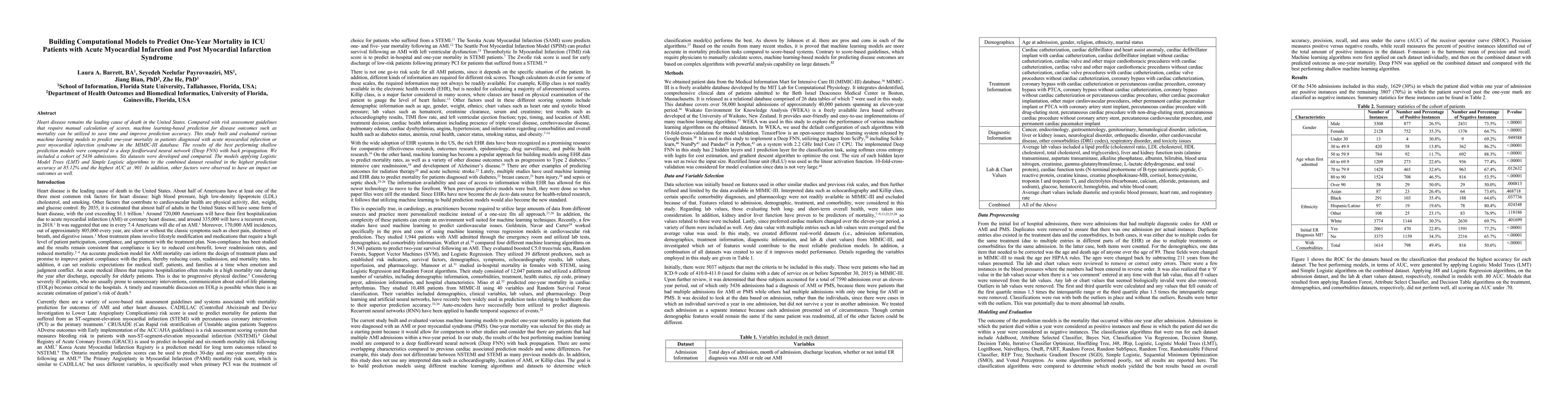 This study developed machine learning models to predict one-year mortality in ICU patients with acute myocardial infarction or post-myocardial infarction syndrome, achieving the highest accuracy of 85.12% and AUC of .901 using Logistic Model Trees and Simple Logistic algorithms. The research compared these models to a deep feedforward neural network, highlighting the potential of machine learning to improve mortality prediction accuracy.