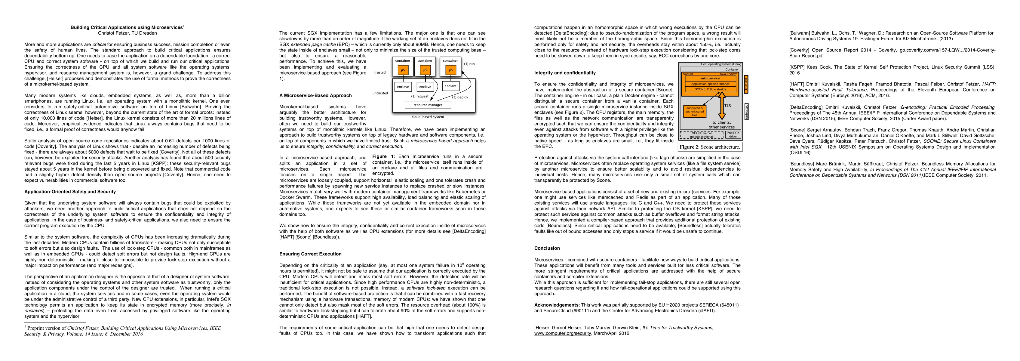 Microservices - combined with secure containers - facilitate new ways to build critical applications. These applications will benefit from many tools and services built for less critical software. The more stringent requirements of critical applications are addressed with the help of secure containers and compiler extensions. While this approach is sufficient for implementing fail-stop applications, there are still several open research questions regarding if and how fail-operational applications could be supported using this approach.