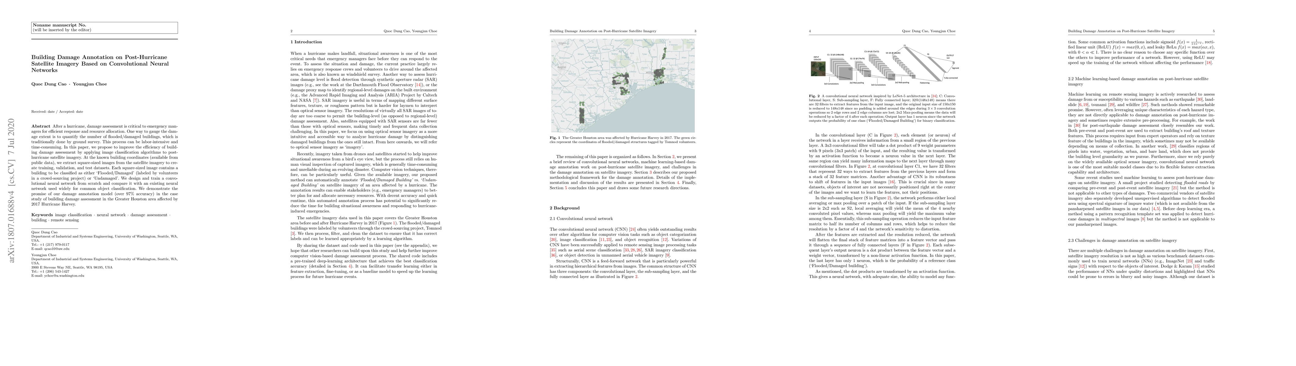 This paper proposes using convolutional neural networks to classify post-hurricane satellite imagery for building damage assessment, achieving over 97% accuracy. It compares its model to existing neural networks, demonstrating significant efficiency improvements over traditional ground surveys.