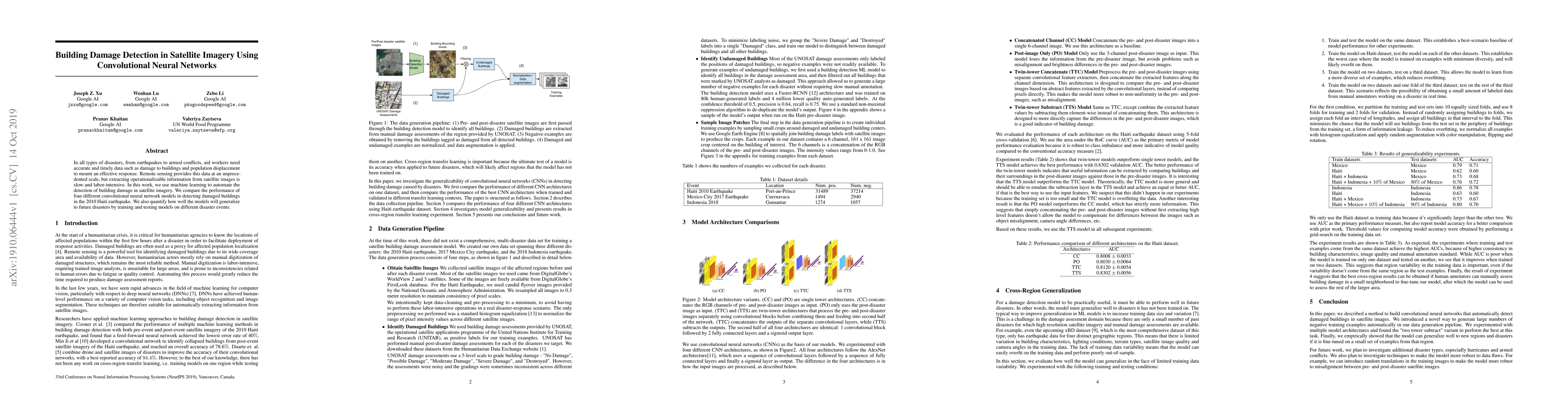 This paper automates the detection of building damage in satellite imagery using convolutional neural networks, comparing four models to identify the most effective one for the 2010 Haiti earthquake, and assessing their generalizability across different disaster events.