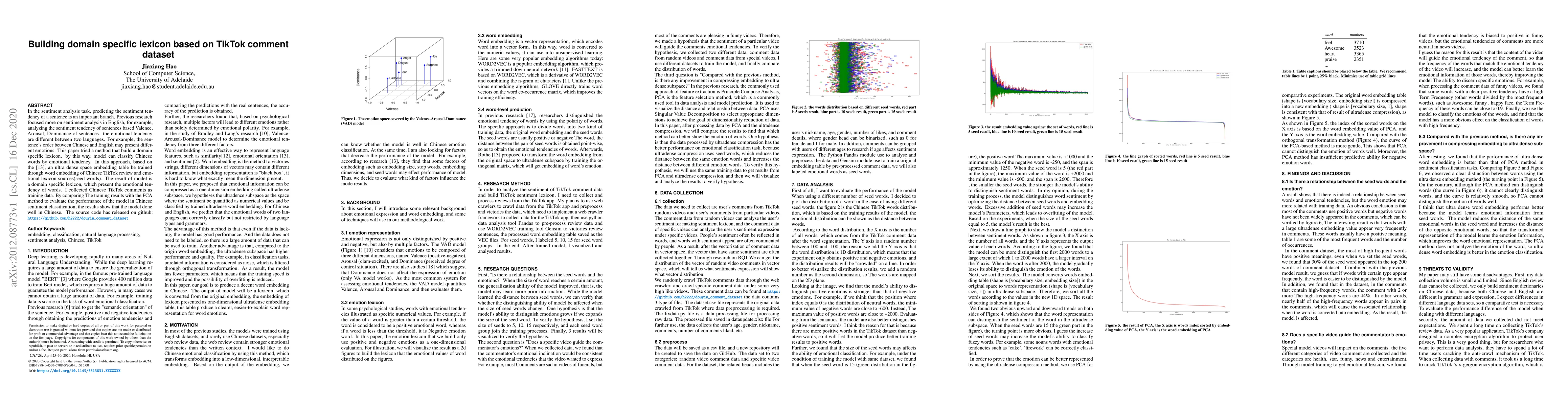 In the sentiment analysis task, predicting the sentiment tendency of a sentence is an important branch. Previous research focused more on sentiment analysis in English, for example, analyzing the sentiment tendency of sentences based on Valence, Arousal, Dominance of sentences. the emotional tendency is different between the two languages. For example, the sentence order between Chinese and English may present different emotions. This paper tried a method that builds a domain-specific lexicon. In this way, the model can classify Chinese words with emotional tendency. In this approach, based on the [13], an ultra-dense space embedding table is trained through word embedding of Chinese TikTok review and emotional lexicon sources(seed words). The result of the model is a domain-specific lexicon, which presents the emotional tendency of words. I collected Chinese TikTok comments as training data. By comparing The training results with the PCA method to evaluate the performance of the model in Chinese sentiment classification, the results show that the model has done well in Chinese. The source code has released on github:https://github.com/h2222/douyin_comment_dataset