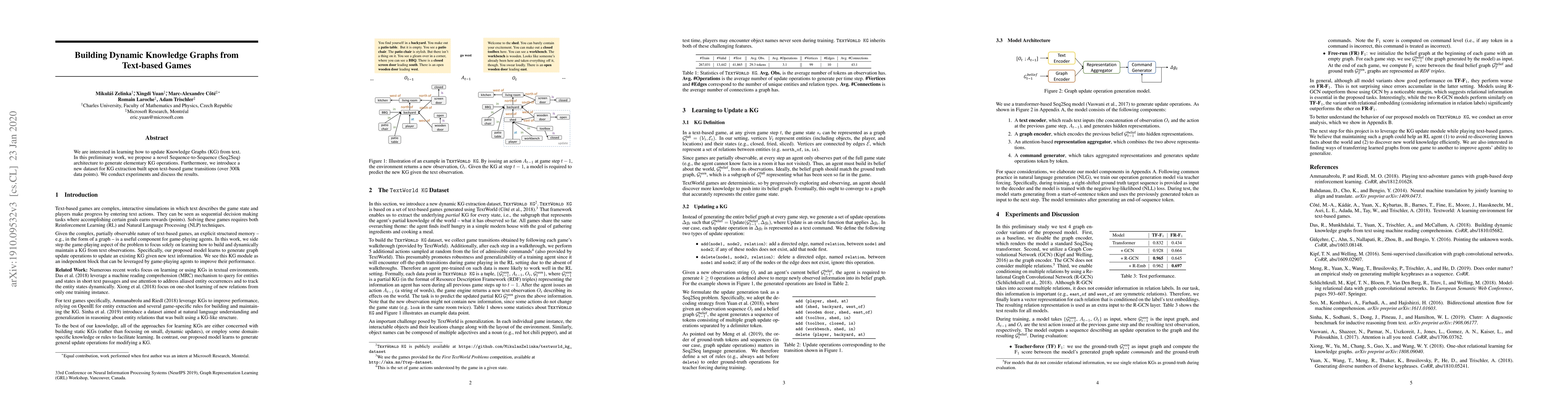 This paper proposes a novel Seq2Seq architecture for dynamically updating Knowledge Graphs from text-based game transitions, and introduces a new dataset of over 300k data points for KG extraction, followed by experimental results and discussions.