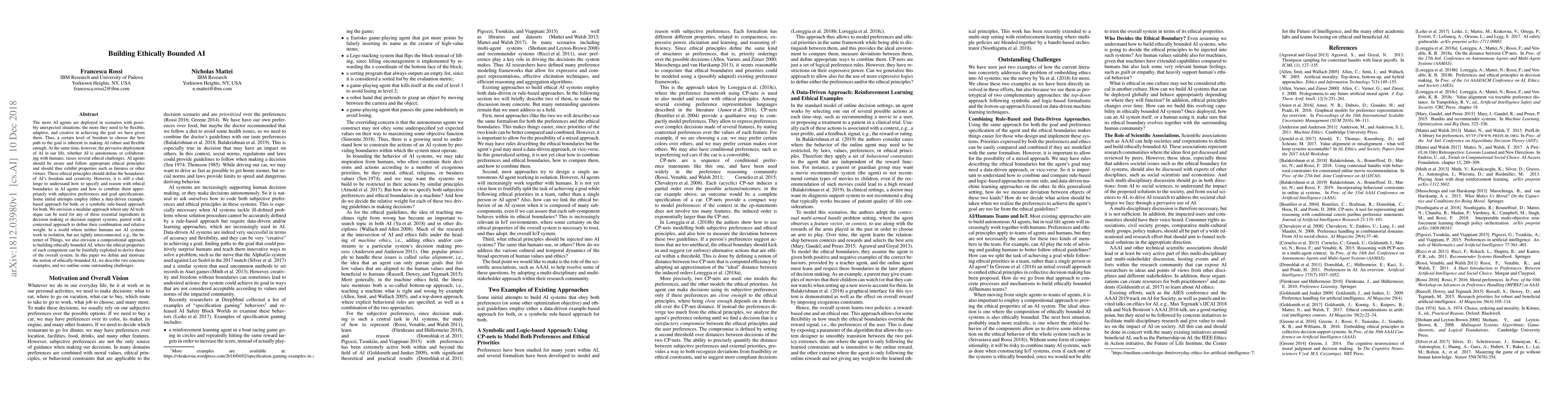 The more AI agents are deployed in scenarios with possibly unexpected situations, the more they need to be flexible, adaptive, and creative in achieving the goal we have given them. Thus, a certain level of freedom to choose the best path to the goal is inherent in making AI robust and flexible enough. At the same time, however, the pervasive deployment of AI in our life, whether AI is autonomous or collaborating with humans, raises several ethical challenges. AI agents should be aware and follow appropriate ethical principles and should thus exhibit properties such as fairness or other virtues. These ethical principles should define the boundaries of AI's freedom and creativity. However, it is still a challenge to understand how to specify and reason with ethical boundaries in AI agents and how to combine them appropriately with subjective preferences and goal specifications. Some initial attempts employ either a data-driven example-based approach for both, or a symbolic rule-based approach for both. We envision a modular approach where any AI technique can be used for any of these essential ingredients in decision making or decision support systems, paired with a contextual approach to define their combination and relative weight. In a world where neither humans nor AI systems work in isolation, but are tightly interconnected, e.g., the Internet of Things, we also envision a compositional approach to building ethically bounded AI, where the ethical properties of each component can be fruitfully exploited to derive those of the overall system. In this paper we define and motivate the notion of ethically-bounded AI, we describe two concrete examples, and we outline some outstanding challenges.