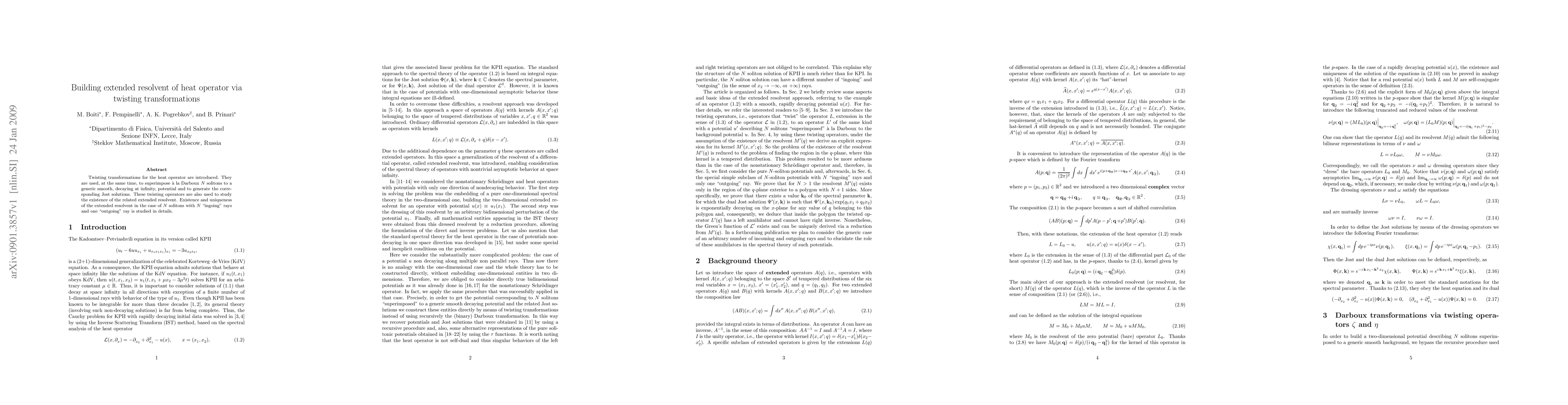 Twisting transformations for the heat operator are introduced. They are used, at the same time, to superimpose a` la Darboux N solitons to a generic smooth, decaying at infinity, potential and to generate the corresponding Jost solutions. These twisting operators are also used to study the existence of the related extended resolvent. Existence and uniqueness of the extended resolvent in the case of $N$ solitons with N "ingoing" rays and one "outgoing" ray is studied in details.