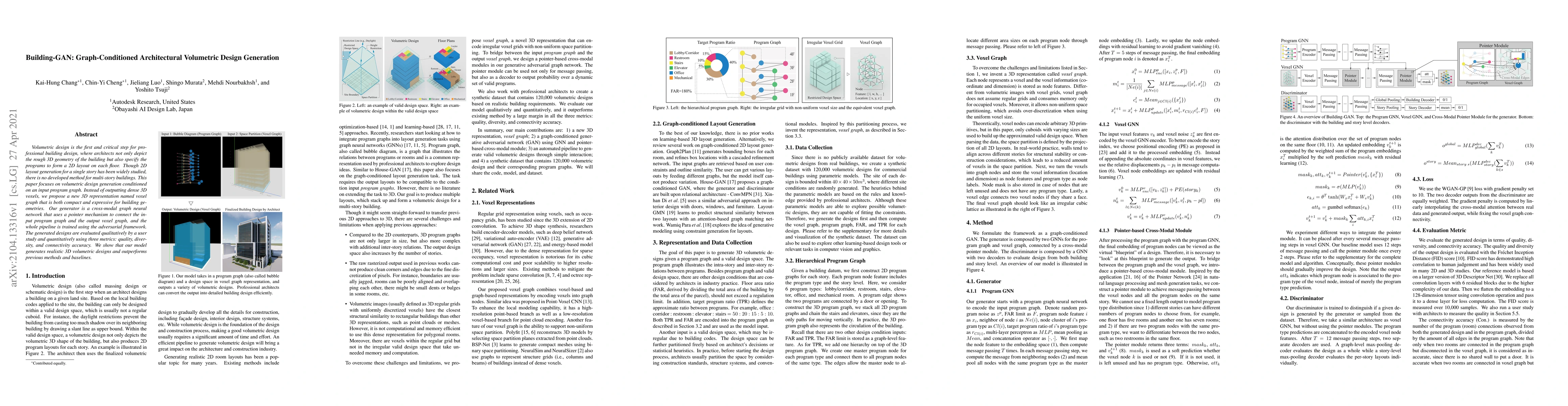 Volumetric design is the first and critical step for professional building design, where architects not only depict the rough 3D geometry of the building but also specify the programs to form a 2D layout on each floor. Though 2D layout generation for a single story has been widely studied, there is no developed method for multi-story buildings. This paper focuses on volumetric design generation conditioned on an input program graph. Instead of outputting dense 3D voxels, we propose a new 3D representation named voxel graph that is both compact and expressive for building geometries. Our generator is a cross-modal graph neural network that uses a pointer mechanism to connect the input program graph and the output voxel graph, and the whole pipeline is trained using the adversarial framework. The generated designs are evaluated qualitatively by a user study and quantitatively using three metrics: quality, diversity, and connectivity accuracy. We show that our model generates realistic 3D volumetric designs and outperforms previous methods and baselines.