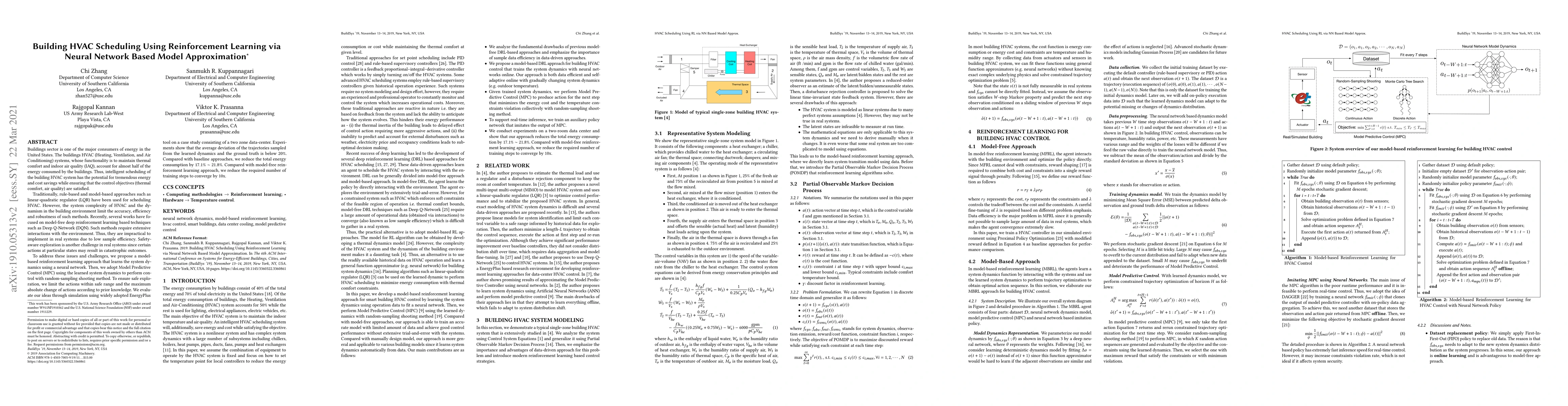This paper proposes a model-based reinforcement learning approach using neural network approximation to efficiently schedule HVAC systems in buildings, achieving energy savings of 17.1% to 21.8% compared to baseline methods. The approach combines model predictive control with safe exploration constraints, reducing training steps by 10x compared to model-free methods.