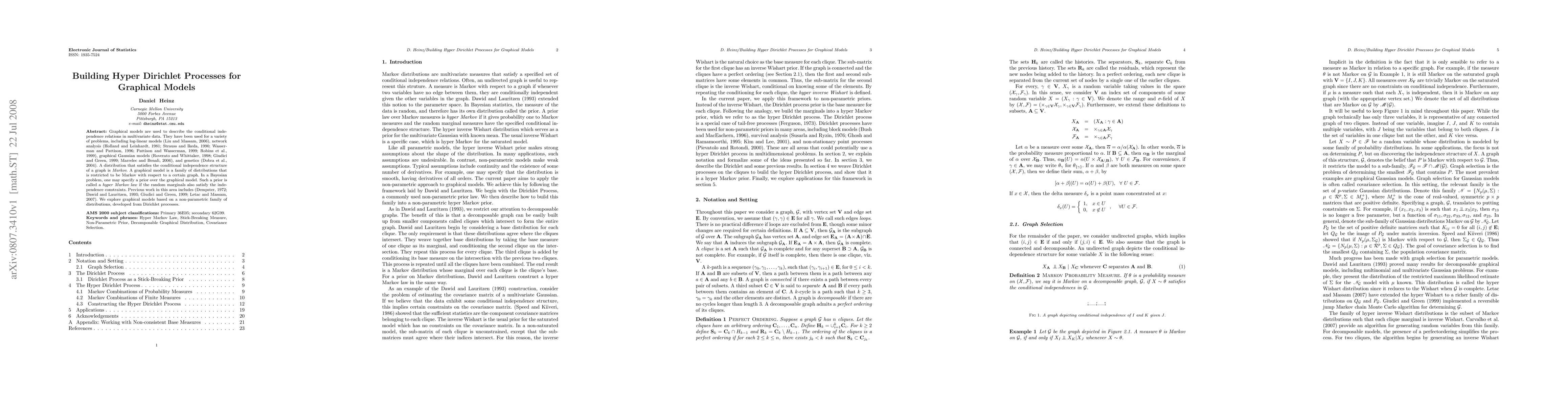 Graphical models are used to describe the conditional independence relations in multivariate data. They have been used for a variety of problems, including log-linear models (Liu and Massam, 2006), network analysis (Holland and Leinhardt, 1981; Strauss and Ikeda, 1990; Wasserman and Pattison, 1996; Pattison and Wasserman, 1999; Robins et al., 1999);, graphical Gaussian models (Roverato and Whittaker, 1998; Giudici and Green, 1999; Marrelec and Benali, 2006), and genetics (Dobra et al., 2004). A distribution that satisfies the conditional independence structure of a graph is Markov. A graphical model is a family of distributions that is restricted to be Markov with respect to a certain graph. In a Bayesian problem, one may specify a prior over the graphical model. Such a prior is called a hyper Markov law if the random marginals also satisfy the independence constraints. Previous work in this area includes (Dempster, 1972; Dawid and Lauritzen, 1993; Giudici and Green, 1999; Letac and Massam, 2007). We explore graphical models based on a non-parametric family of distributions, developed from Dirichlet processes.