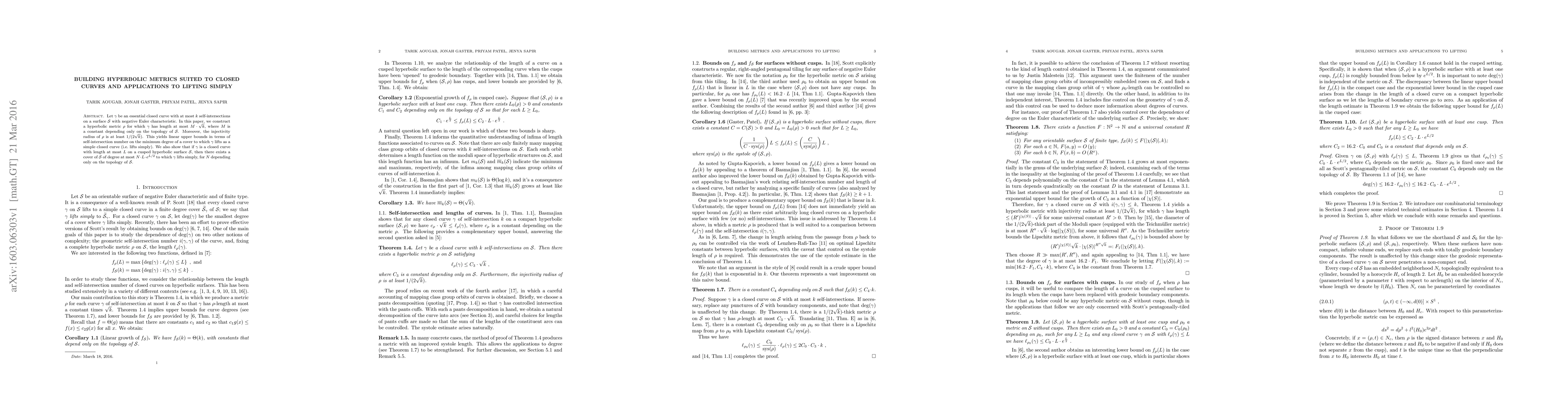 Let $\gamma$ be an essential closed curve with at most $k$ self-intersections on a surface $\mathcal{S}$ with negative Euler characteristic. In this paper, we construct a hyperbolic metric $\rho$ for which $\gamma$ has length at most $M \cdot \sqrt{k}$, where $M$ is a constant depending only on the topology of $\mathcal{S}$. Moreover, the injectivity radius of $\rho$ is at least $1/(2\sqrt{k})$. This yields linear upper bounds in terms of self-intersection number on the minimum degree of a cover to which $\gamma$ lifts as a simple closed curve (i.e. lifts simply). We also show that if $\gamma$ is a closed curve with length at most $L$ on a cusped hyperbolic surface $\mathcal{S}$, then there exists a cover of $\mathcal{S}$ of degree at most $N \cdot L \cdot e^{L/2}$ to which $\gamma$ lifts simply, for $N$ depending only on the topology of $\mathcal{S}$.